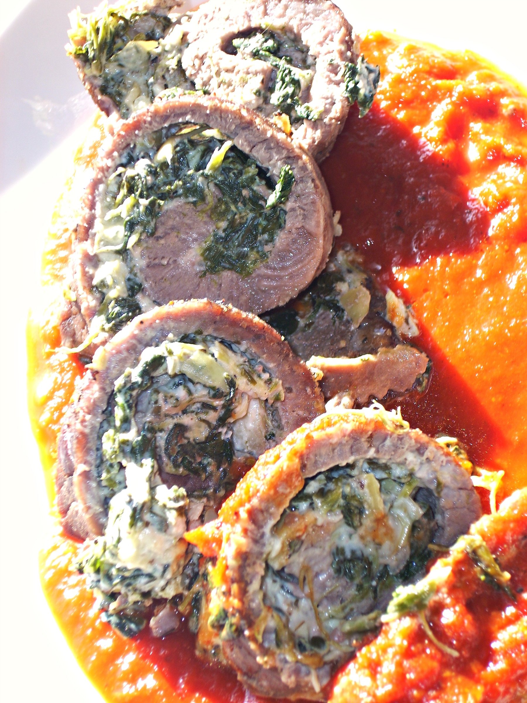 Italian Stuffed Beef Rolls with Roasted Red Pepper Sauce.