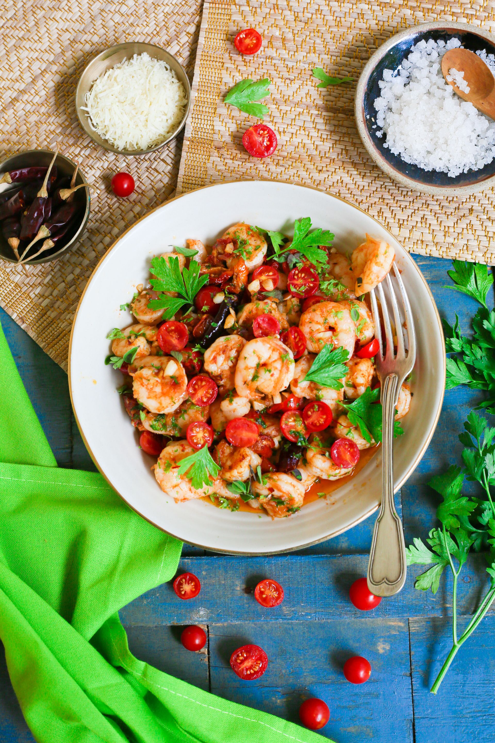 This Italian style garlicky, buttery prawns cooked in a cherry tomato sauce are a family favourite that helped us survive the lockdown! Quick and easy, they have a sauce that needs to be mopped up with some crusty fresh bread. Leftovers from this recipe make a great breakfast – prawns on toast topped with a fried egg!