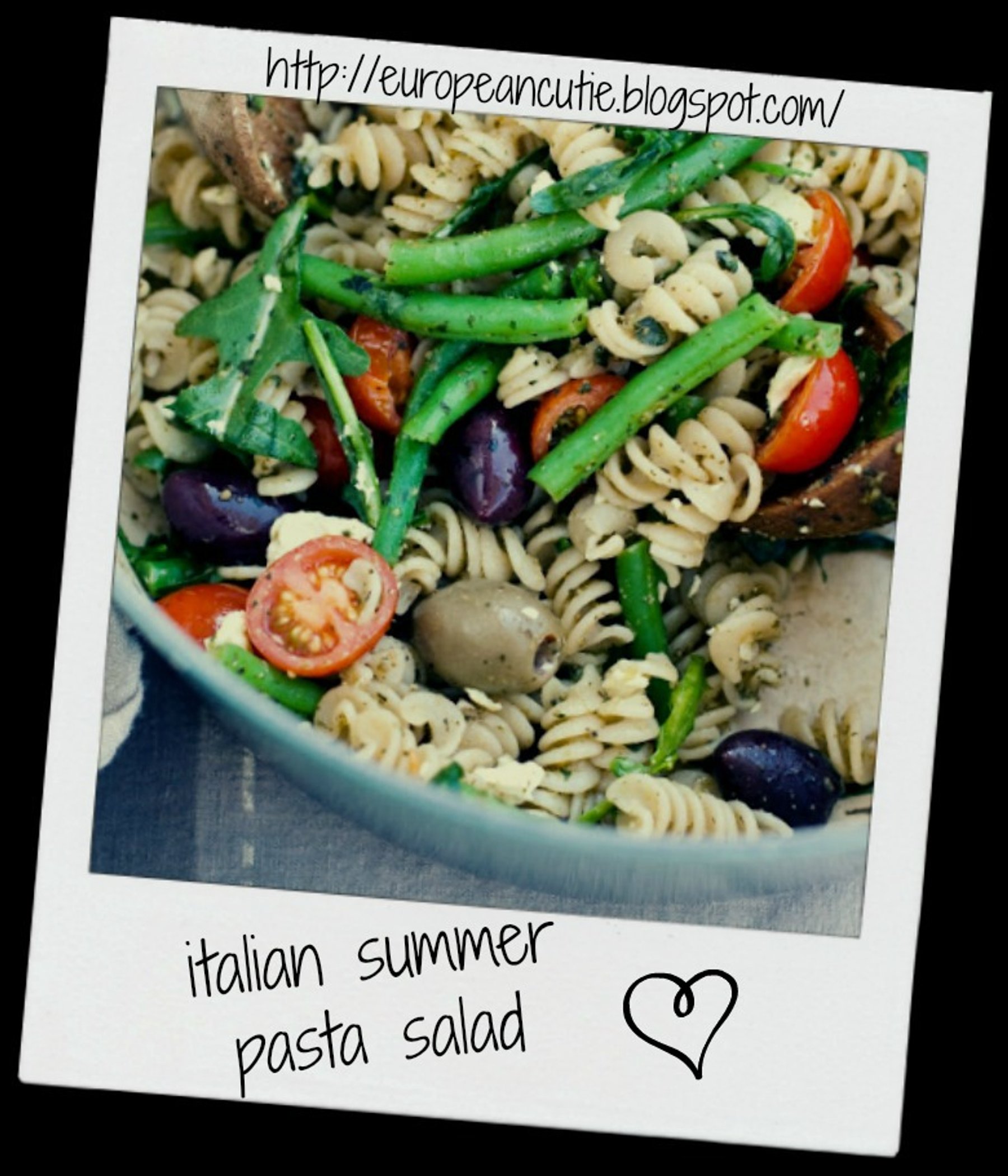 Cook noodles to all dente, meanwhile chop up the tomatoes and green beans, let pasta cool, add olive oil, pesto arugula, thyme, olives, veggies, mix add salt and pepper, and squeeze with fresh lemon! serve...