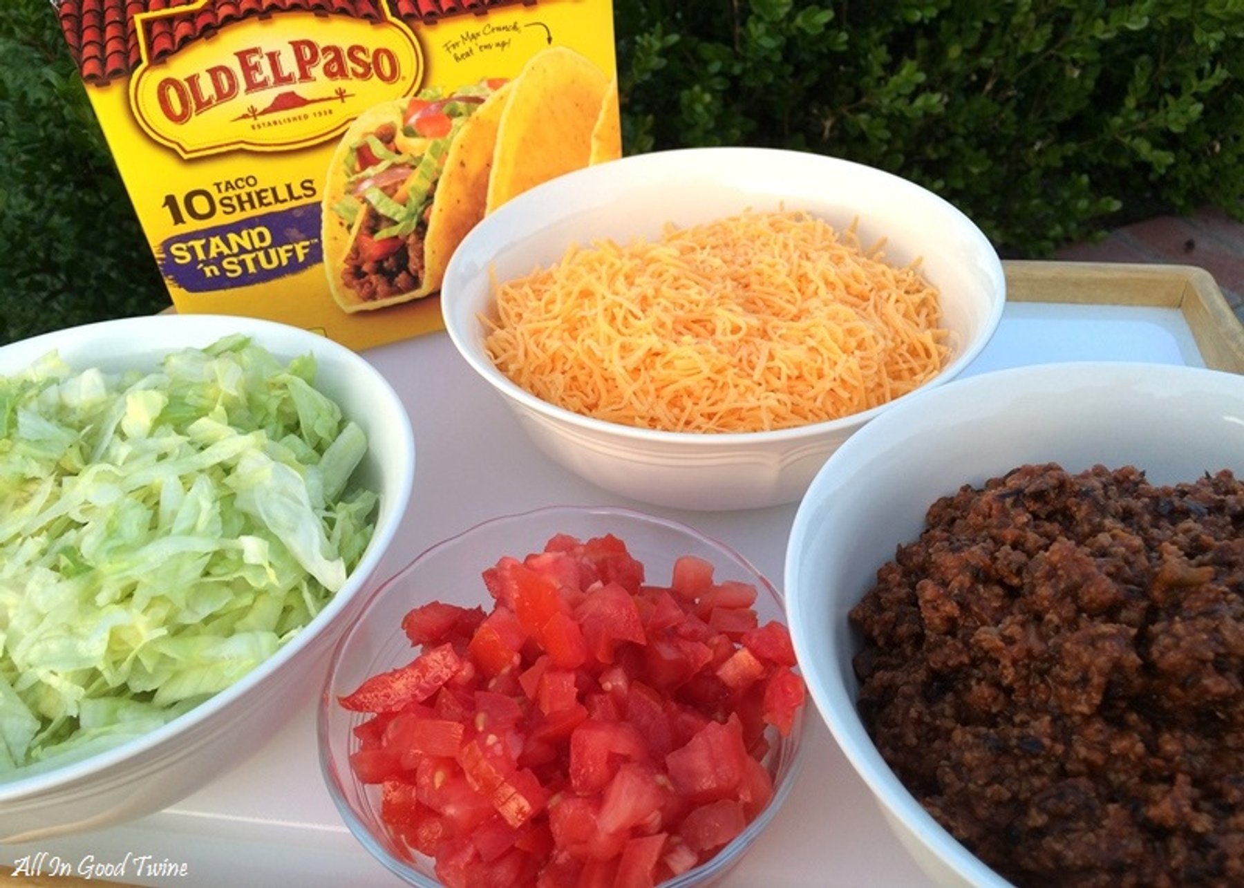 Cook meat, drain grease, add remaining ingredients and simmer to blend flavors. Heat taco shells in the oven until hot. Fill shells with taco meat and top with cheese, lettuce and tomatoes!
