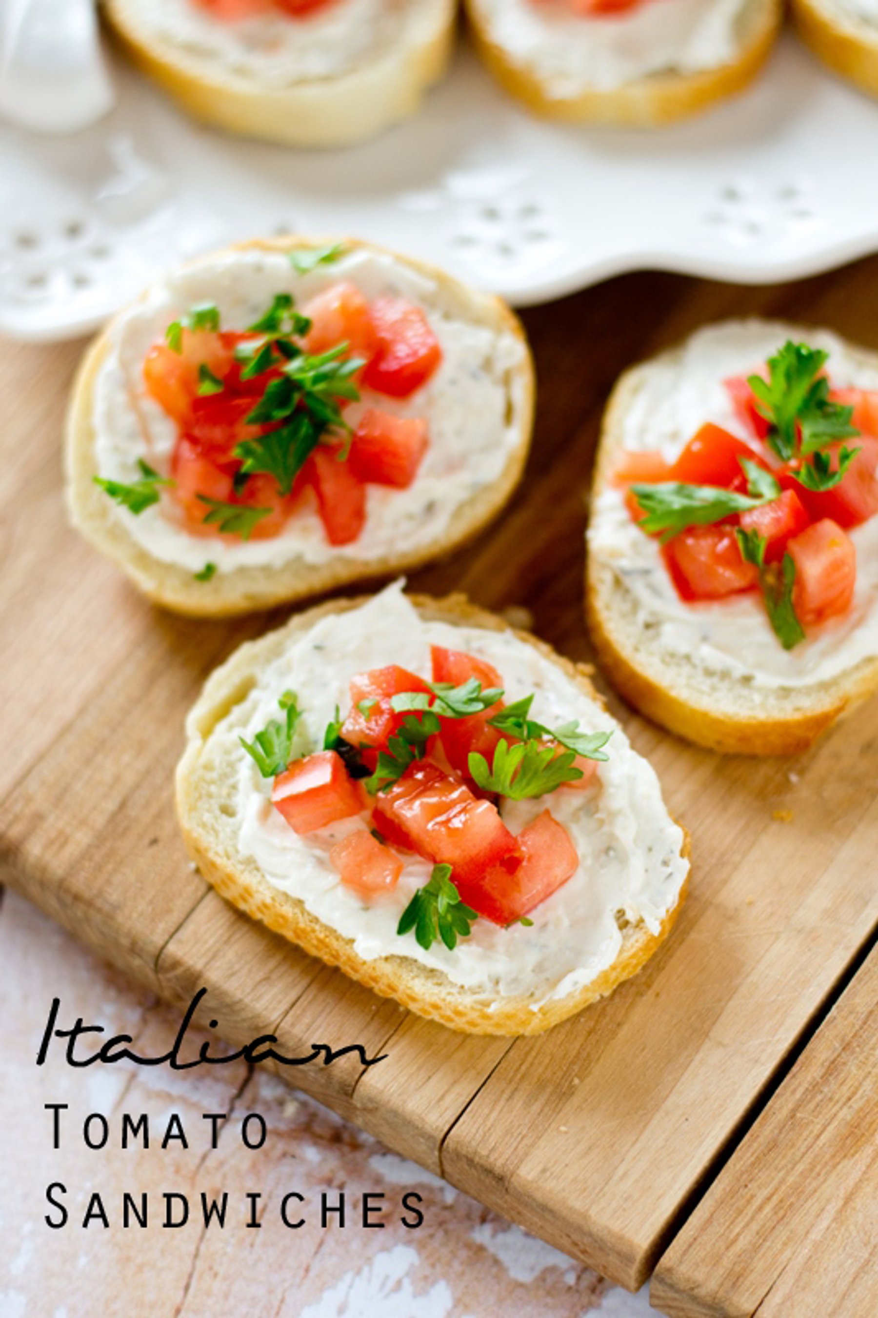 Soft Italian bread with a garlic Parmesan cream cheese spread. These mini Italian tomato sandwiches with fresh parsley make a great appetizer or lunch.