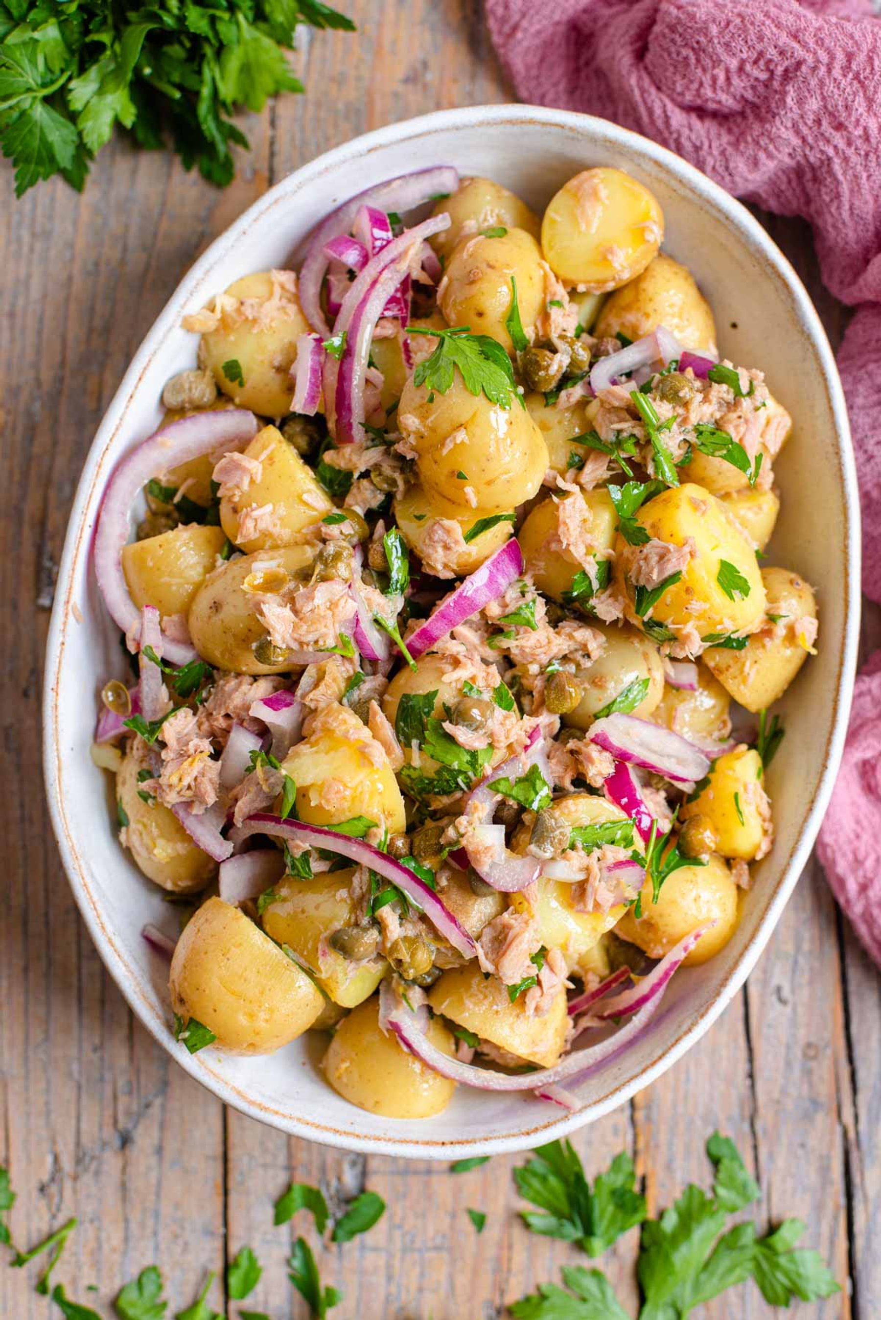 A super simple Italian Tuna Potato Salad made with baby potatoes, red onion and capers tossed in an easy olive oil and fresh lemon dressing.