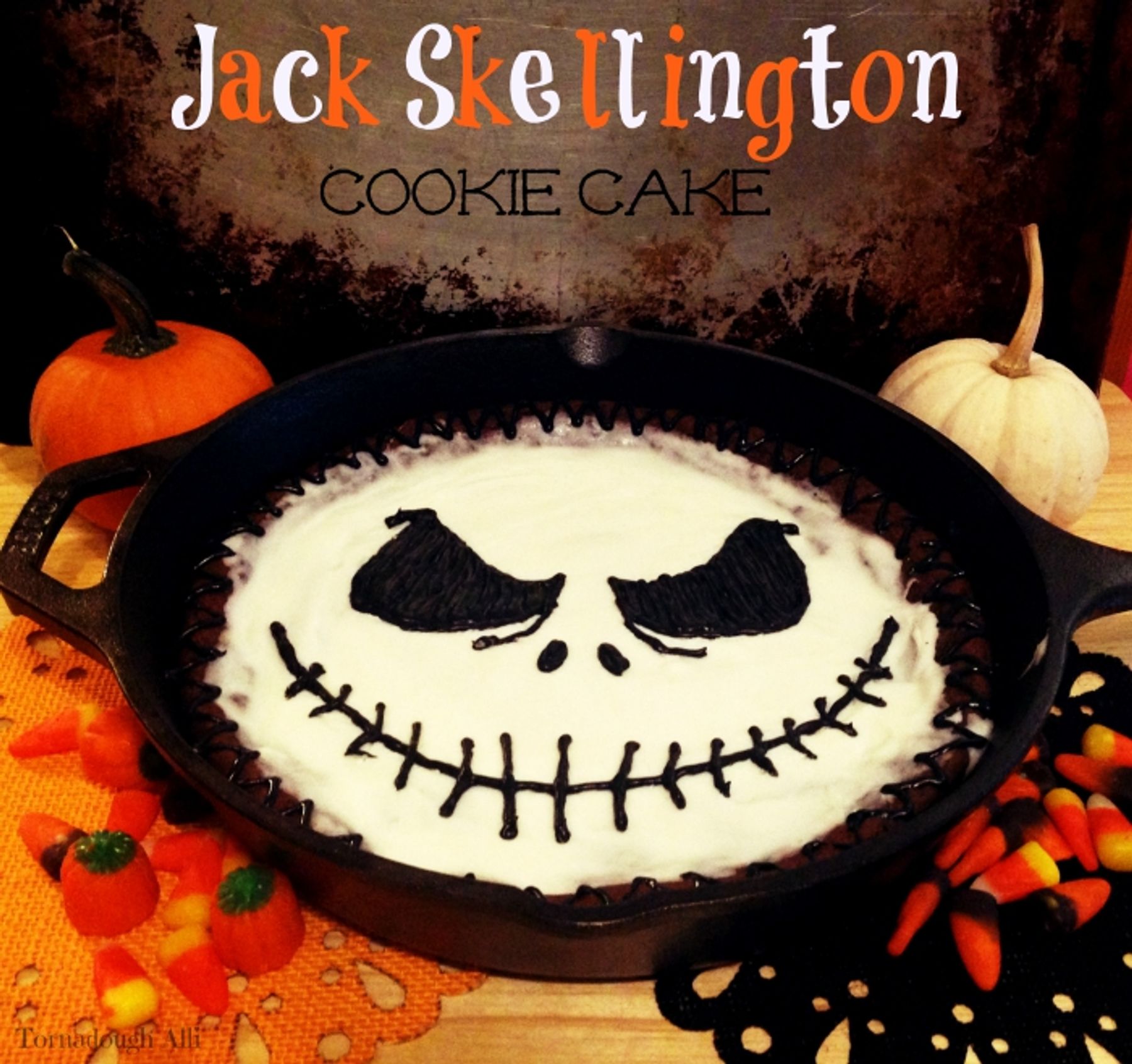 A spooky cookie cake for Halloween stuffed with candy corn and glazed with frosting and the ever popular Jack Skellington!