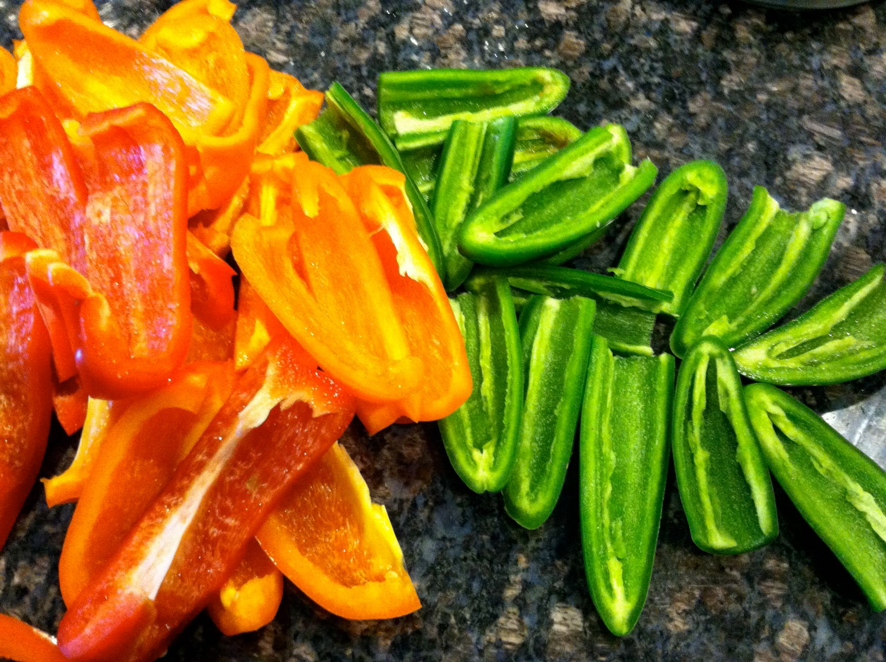 3-4 Bell Peppers, 6-10 seeded jalapenos, 1 cup cider vinegar, 1/2 tsp butter, 1 package pectin, 5 cups sugar, green food coloring(optional)