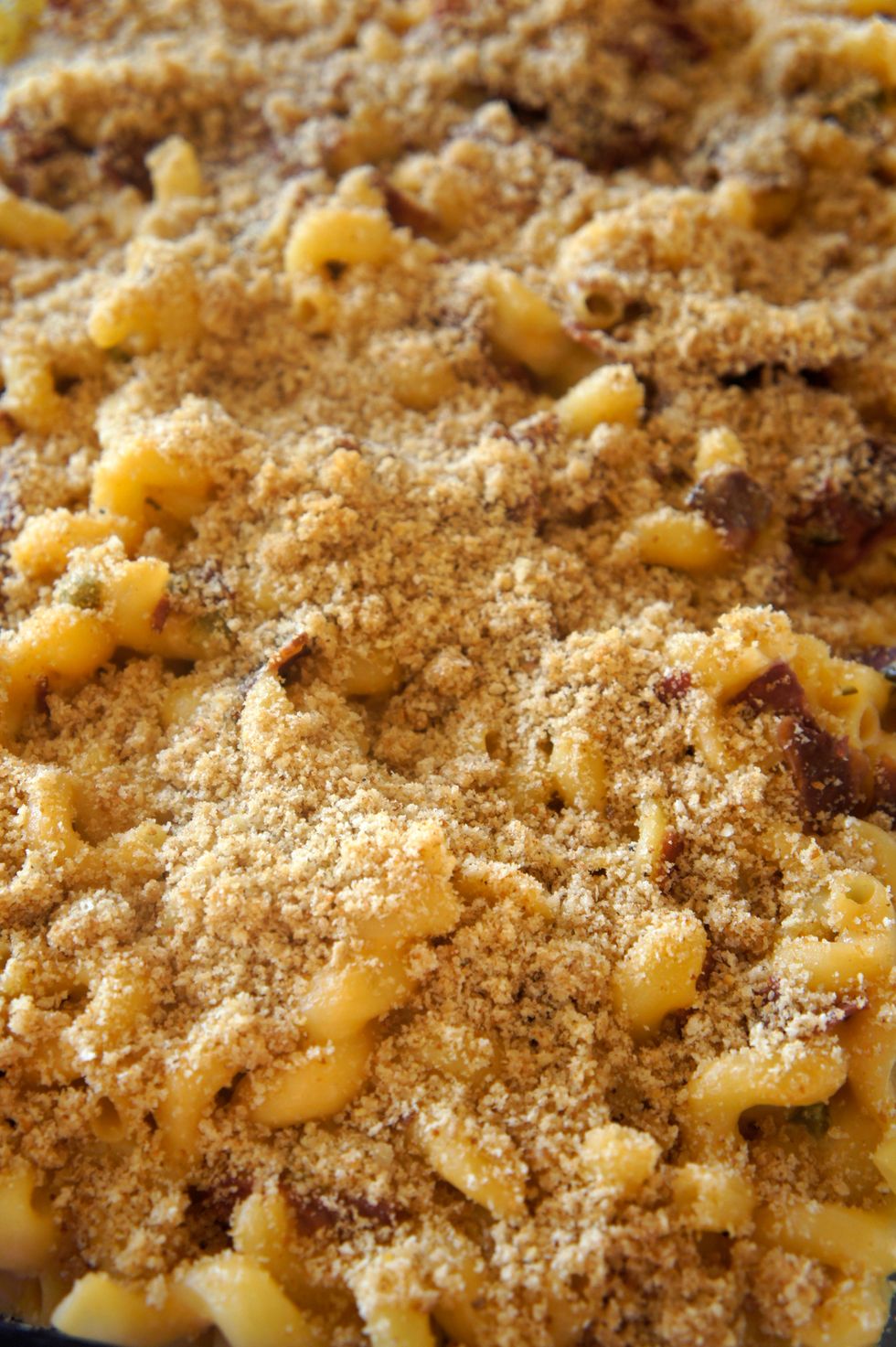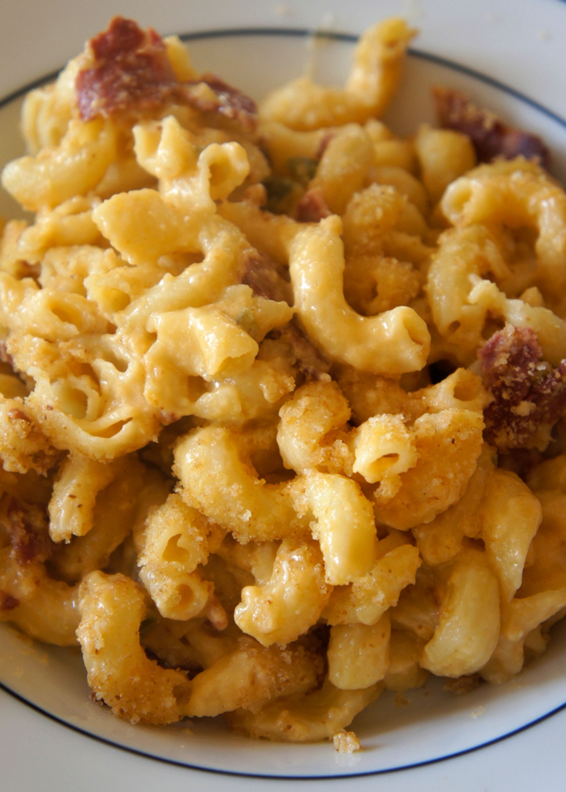 A cheesy, creamy and slightly spicy macaroni and cheese.