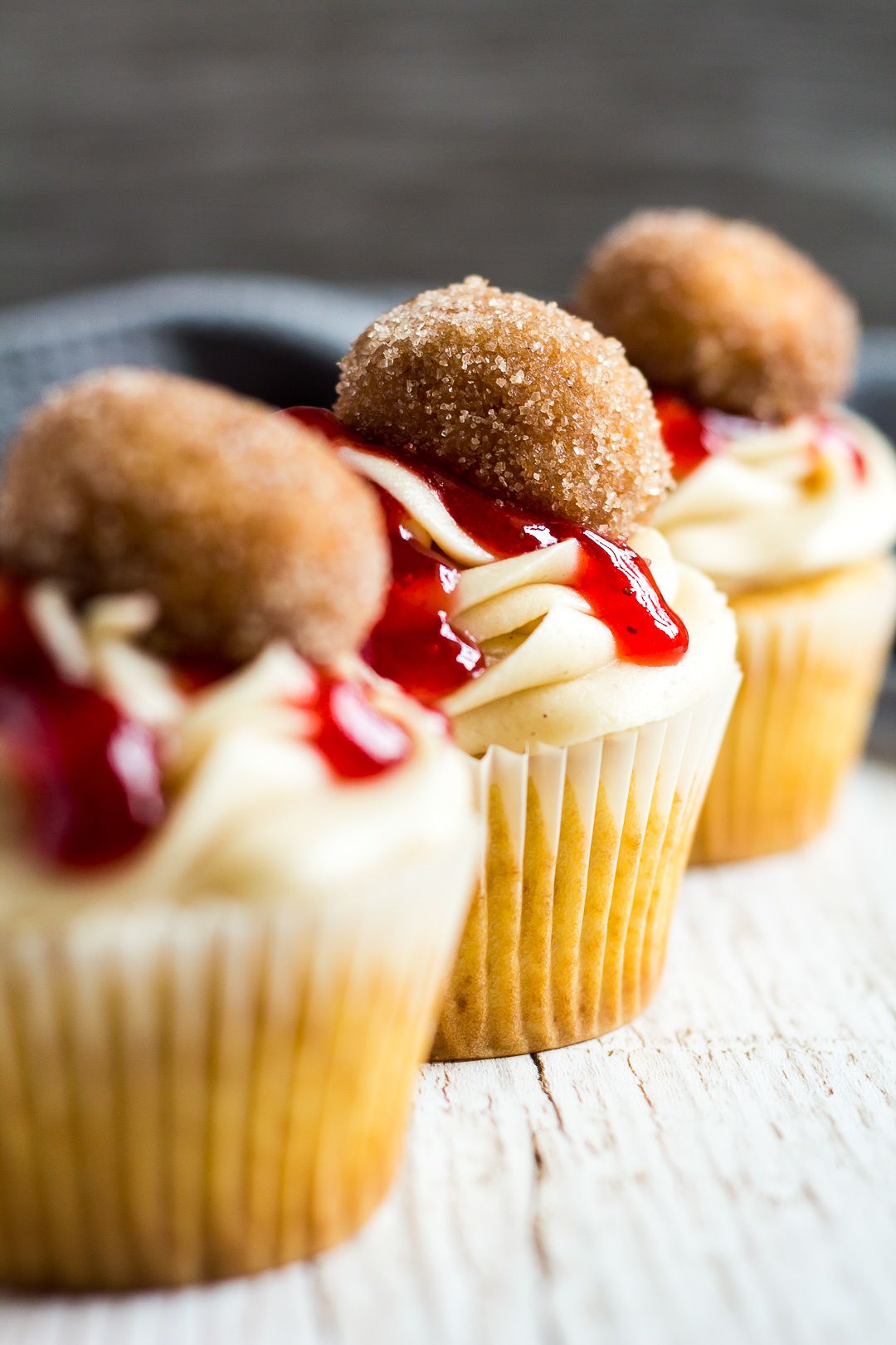 Deliciously moist and fluffy vanilla-infused cupcakes filled with strawberry jam, and topped with a cinnamon-spiced buttercream frosting, and homemade doughnuts!