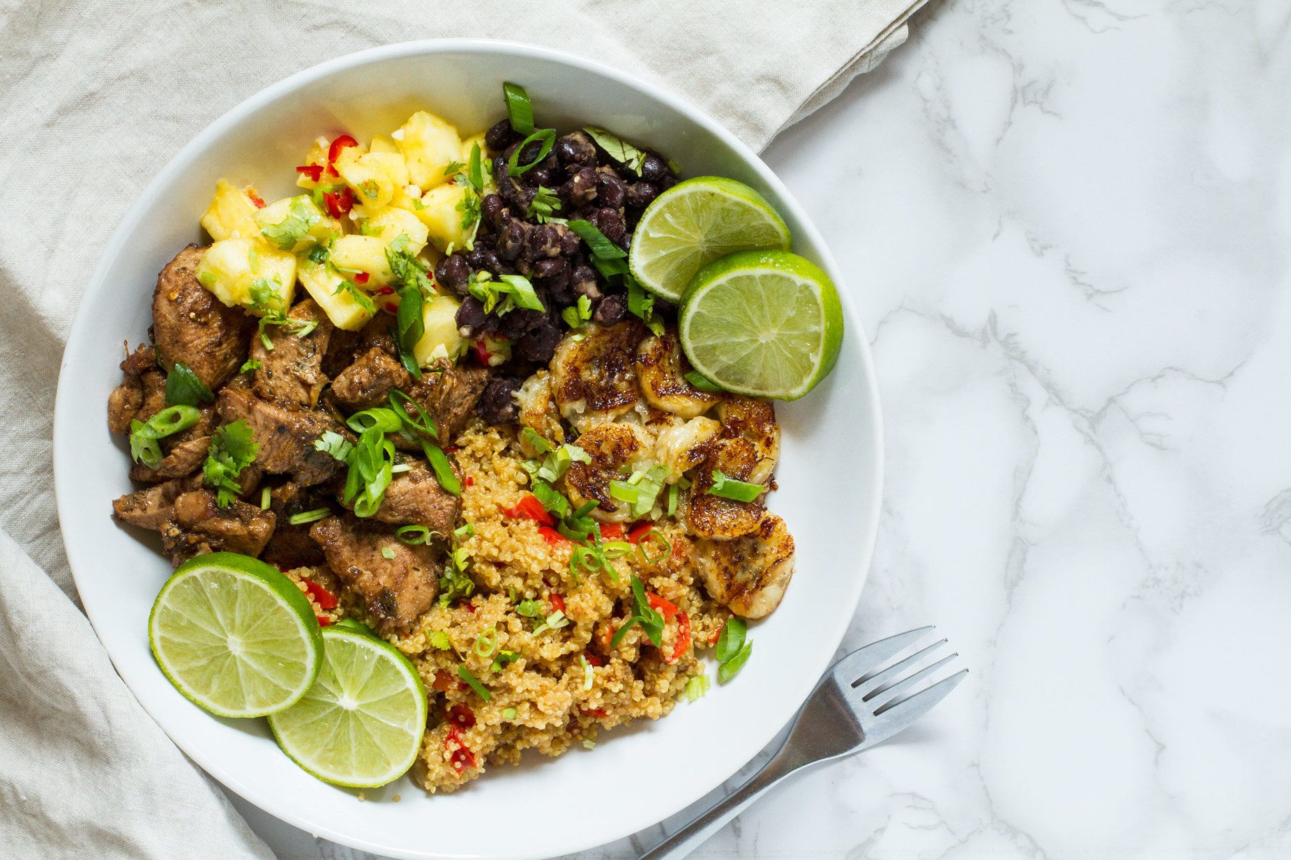 Jamaican Jerk Chicken Quinoa Bowl with Pineapple Salsa and Fried Bananas