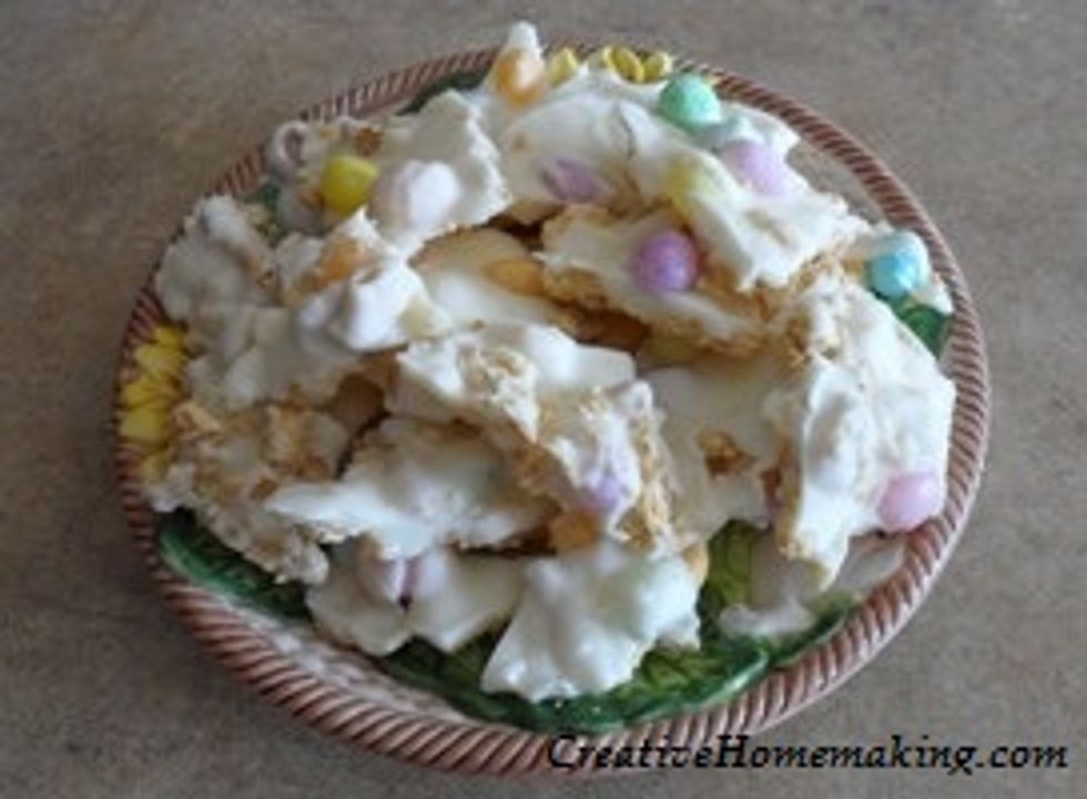 Easy white chocolate candy bark recipe you can make for Easter from cookies and jelly beans.