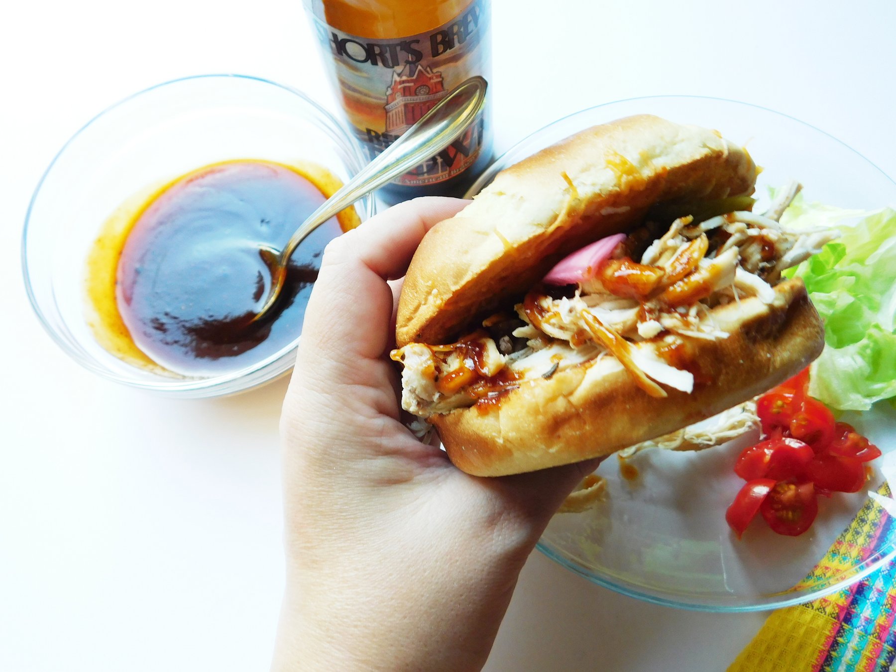 A vacation from the normal sandwich. Jerk seasoning slow cooks with chicken. Top it on a toasted bun. Drizzle with spicy sauce then pickled red onion and jalapenos.