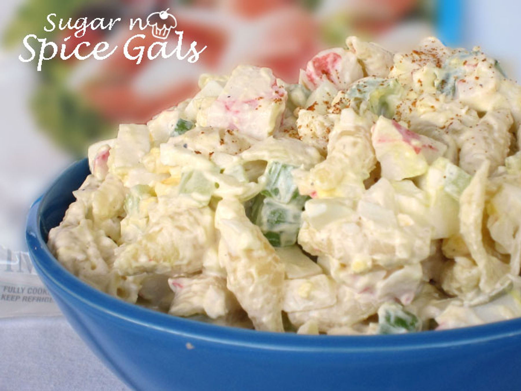 Cook pasta according package directions. Rinse and cool. Boil the eggs and peel. Chop the crab into small pieces. In a large bowl, combine the pasta, crab, celery, onions and eggs. In a small bowl, mix...