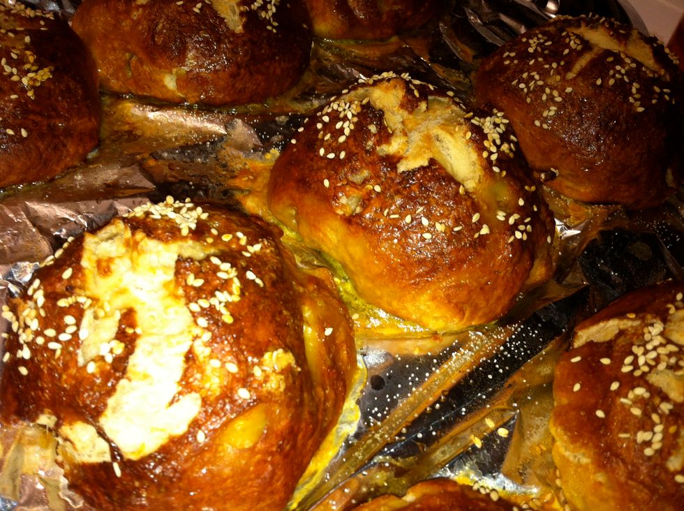 5. Punch down the dough and divide into 9 sections. Shape the dough sections into small balls. Place on a greased cookie sheet and allow to rise again for 30 minutes.