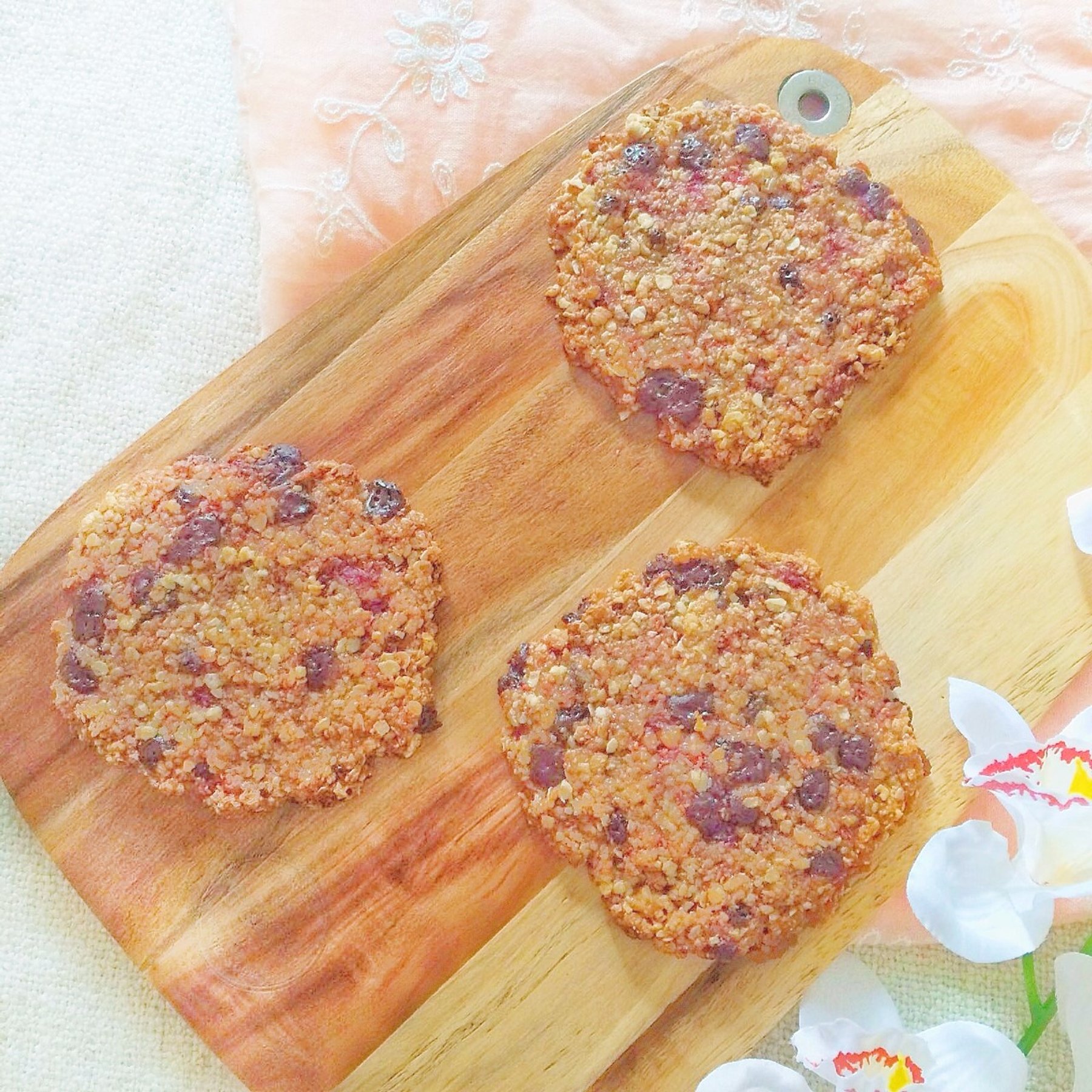 Raspberry and Dark Chocolate Oatie Vegan Biscuit Recipe. Delicious, gluten and refined sugar free.