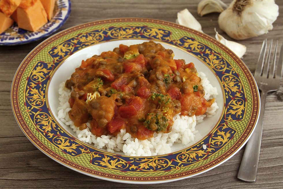 Kabocha Squash makes for the base of this delicious and hearty curry. It is chock full of lentil, tomatoes and spices for a healthy easy meal.