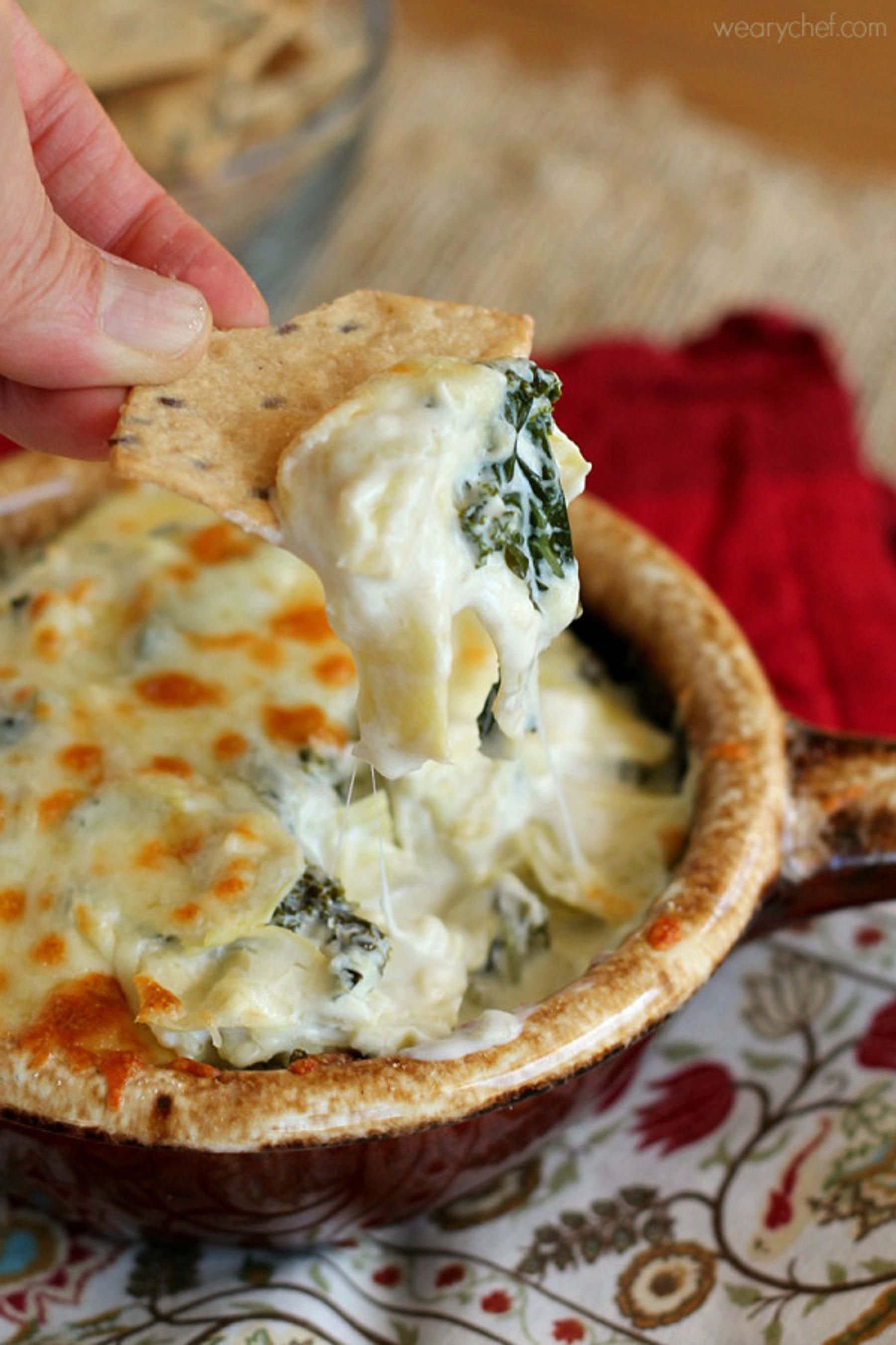 This creamy dip is really easy to make and doesn’t have mayonnaise, which I’m not a fan of in my dips. It uses reduced-fat ingredients to be slightly better for you than its heavier counterparts, and the kale adds a new twist on the classic spinach artichoke dip. This artichoke dip would be perfect for a girls night, watching football, or holiday parties!