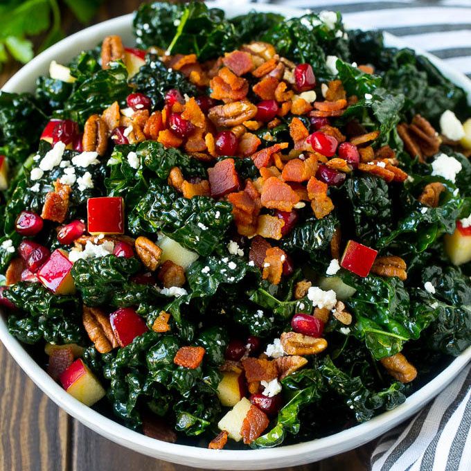 This kale salad is loaded with apples, bacon, pomegranate, feta cheese and pecans, all tossed together in a homemade dressing. A fresh and vibrant salad that's the perfect side dish for any occasion.