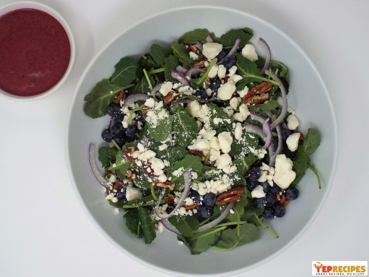 Baby kale tossed with onion, blueberries, pecans, and feta with a fresh blueberry and chia seed vinaigrette.
