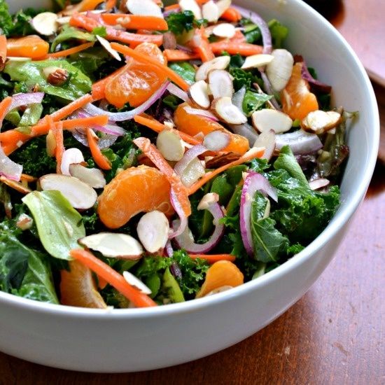 This delectable Kale Salad with Ginger Vinaigrette makes eating healthy a pleasure. It is a perfect lunch or light supper option. For the most optimal flavor use fresh mandarin oranges and fresh grated ginger in your dressing.