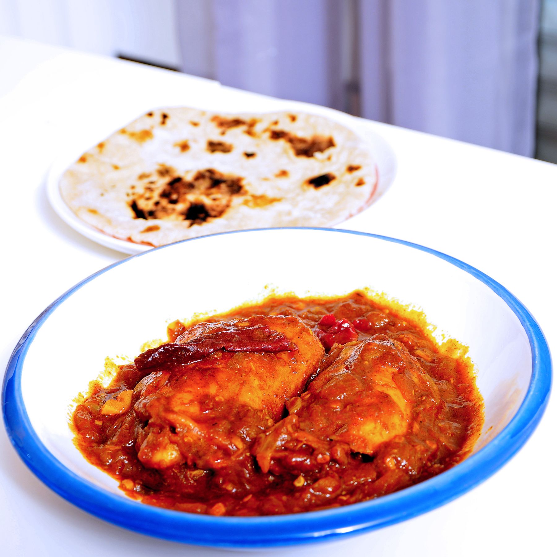 Kashmiri mirch (dried Kashmiri chilies) are flavorsome chili peppers that give a bright red color to the dish but not hot and pungent. I used them to flavor my Indian curry inspired chicken dish.