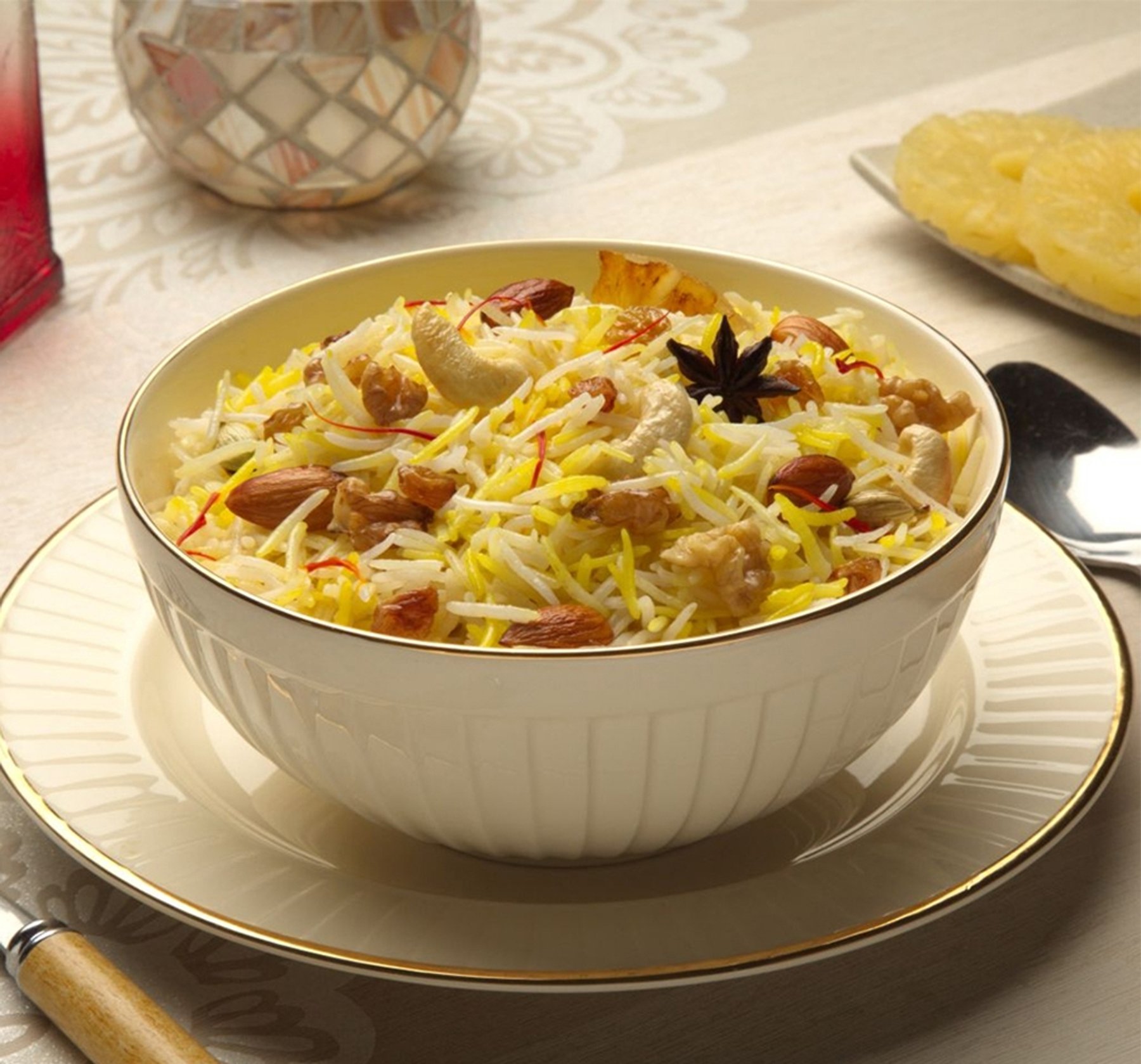 Lets cook a rich Kashmiri Dish, Kashmiri Pilaf with royal ingredients like saffron, milk and dry fruit and garnish it with golden grilled figs or grilled pineapple for make it appealing.