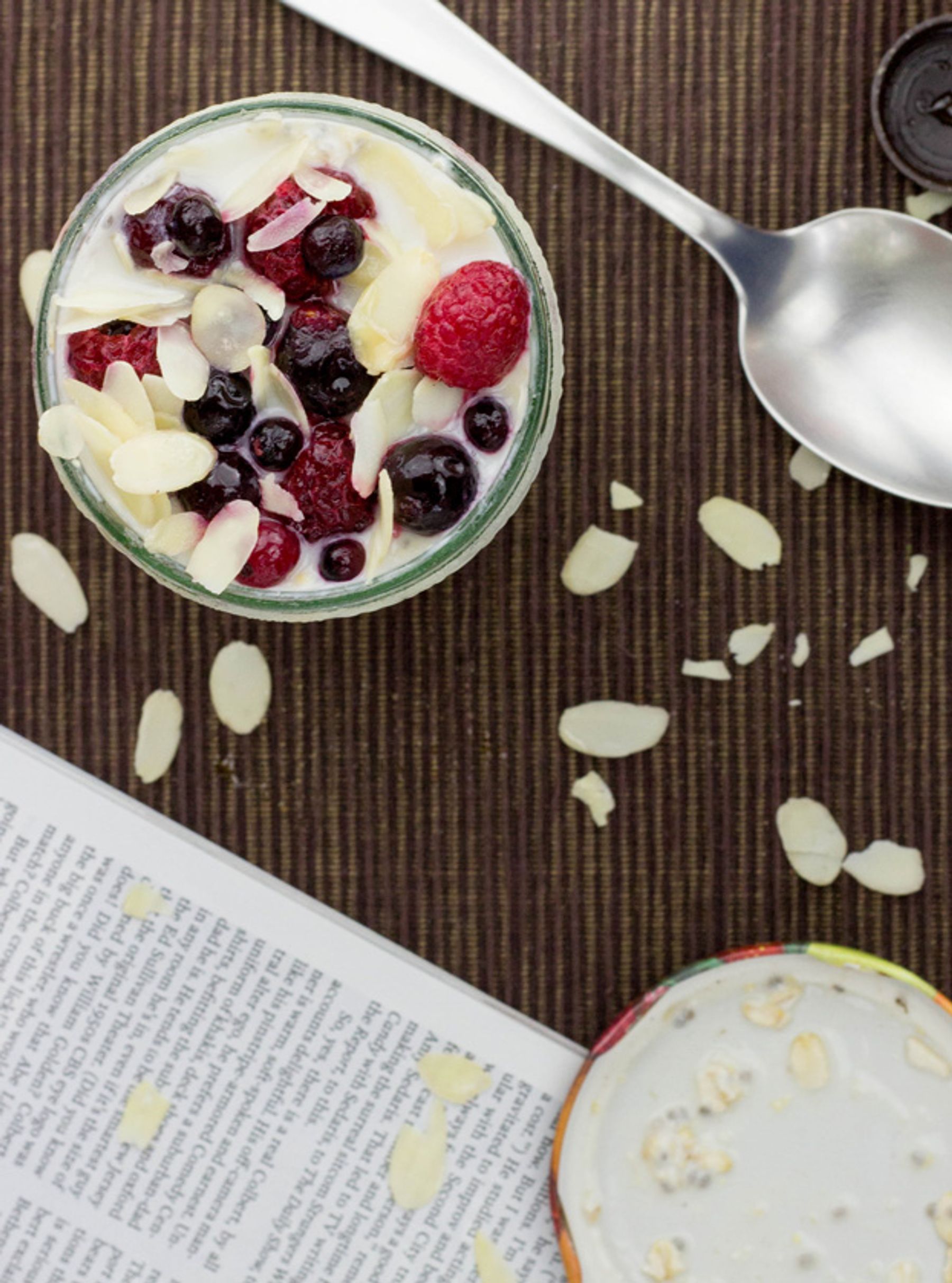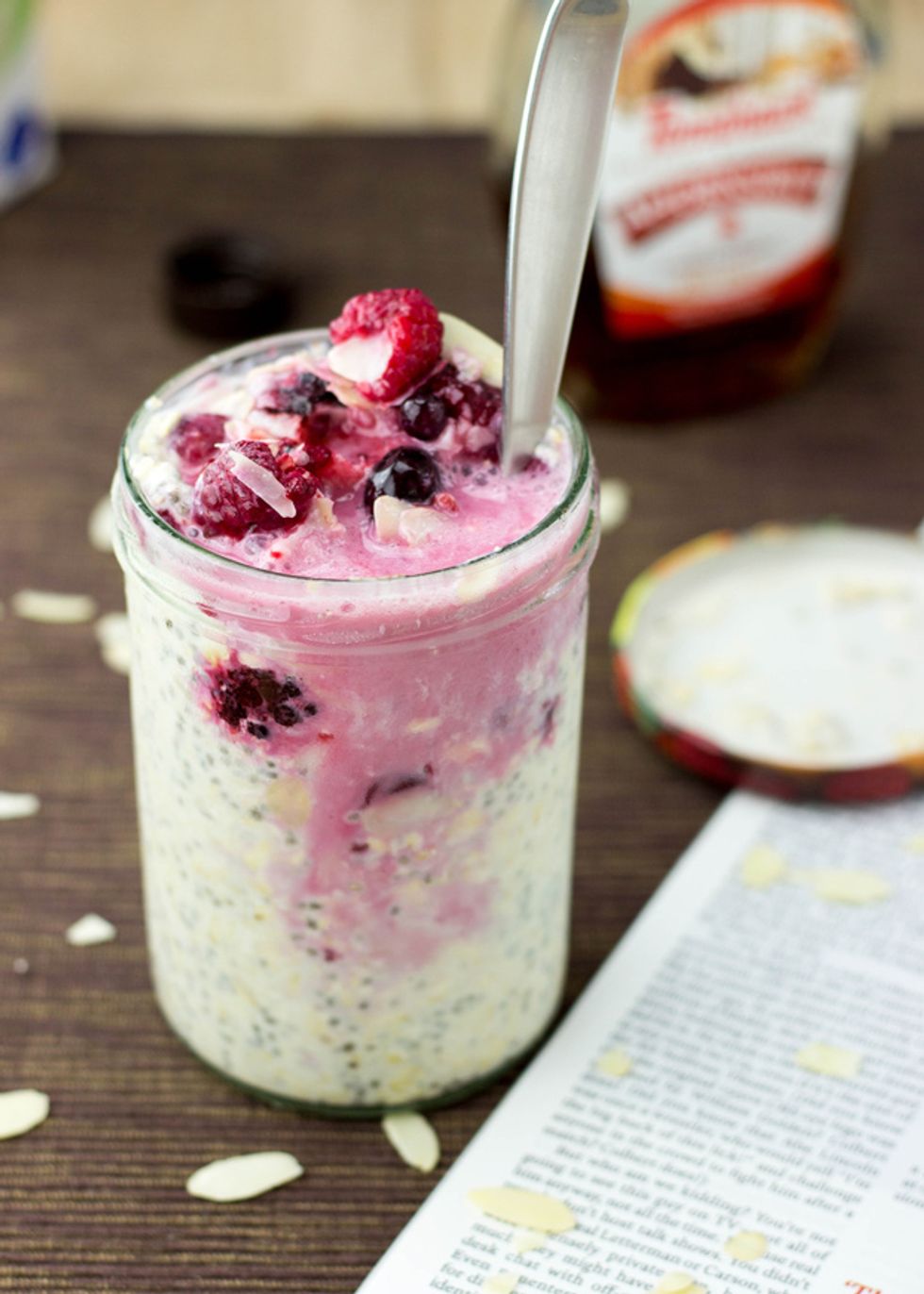Put the oats, chia seeds yogurt and the almond milk into a jar. Stir until everything is mixed together nicely. Pro tip: If you have a big enough jar you can also just close it and shake. Boom!