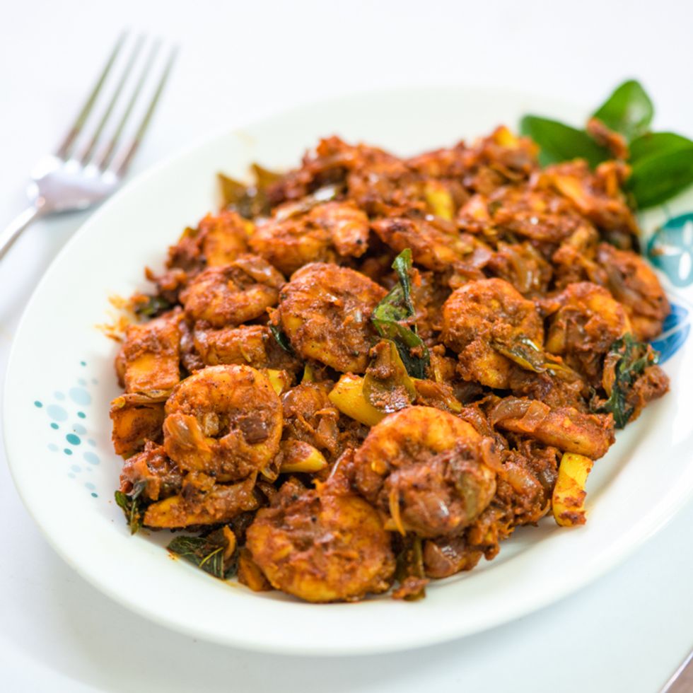 Kerala Prawns Roast is an exotic seafood delicacy of Kerala exceptionally spicy with small onions, coconut pieces and Malabar Tamarind.