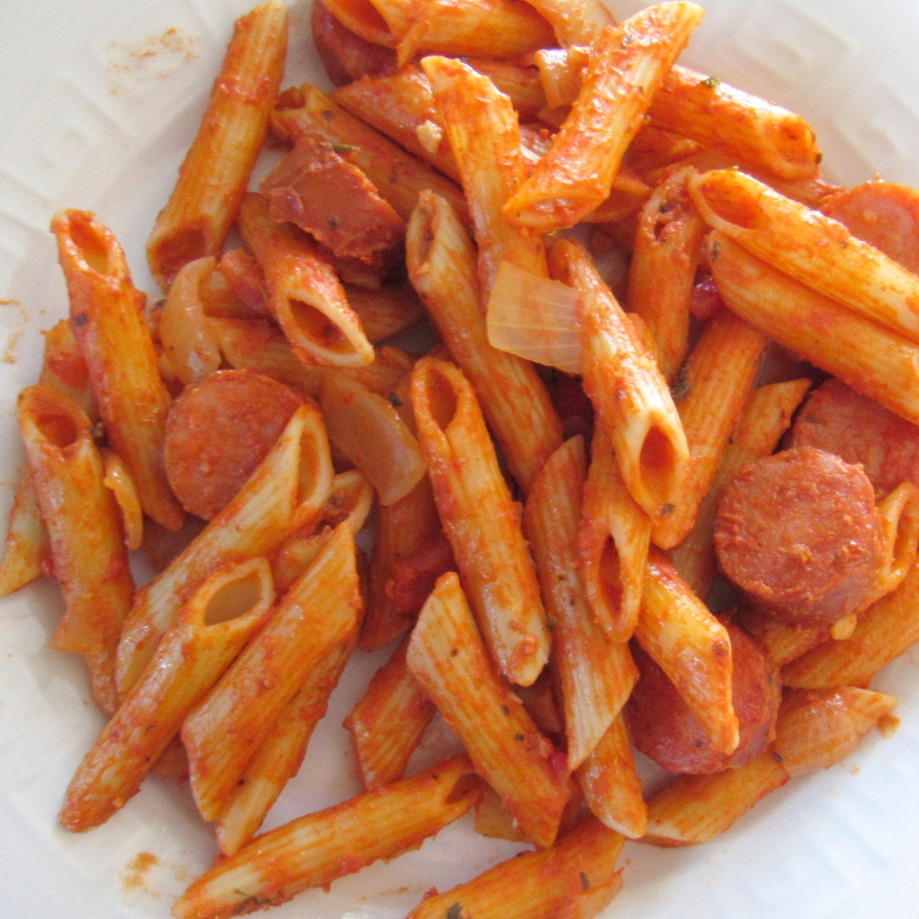 In a skillet over medium heat, sauté onion in butter until lightly brown. Add in sliced kielbasa and cook until crispy. Pour in vodka and let cook for 10 minutes.