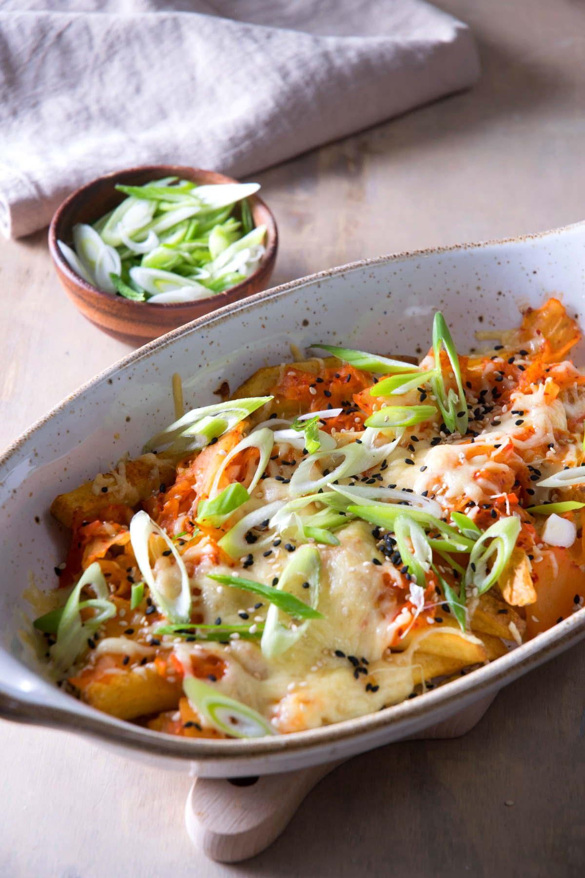 Kimchi Fries IntheKitchDecember 13, 2021 38 In the KitchCrispy baked fries are covered in melted emmental cheese, tangy kimchi, sesame seeds, green onions and a spicy kimchi sauce.4Try itSee the full directions on my site