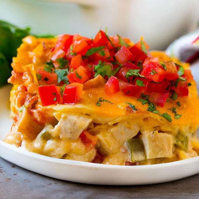 This King Ranch chicken is a casserole made with layers of corn tortillas, creamy chicken, vegetables and cheese, all baked to bubbly perfection. An easy dinner option that's perfect for feeding a crowd!
