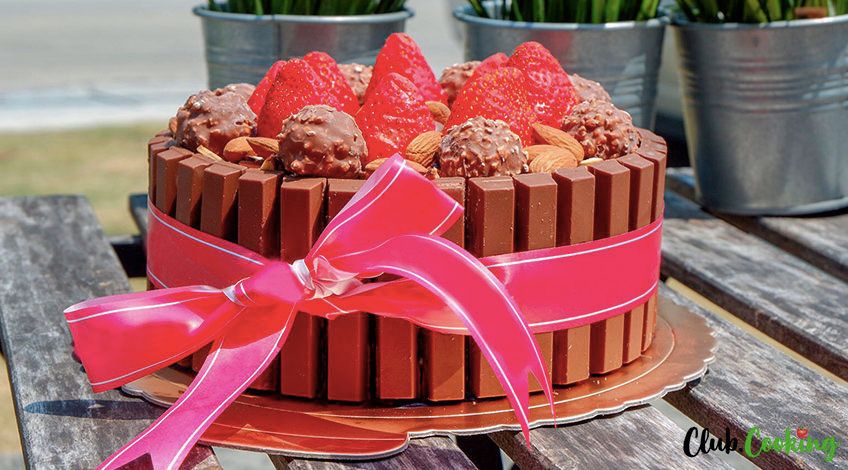 My family always jokes that it's like this Kit Kat Cake went trick-or-treating secretly and dumped all the goodies all over itself. And it does look like a basket full of sweets and fruit.