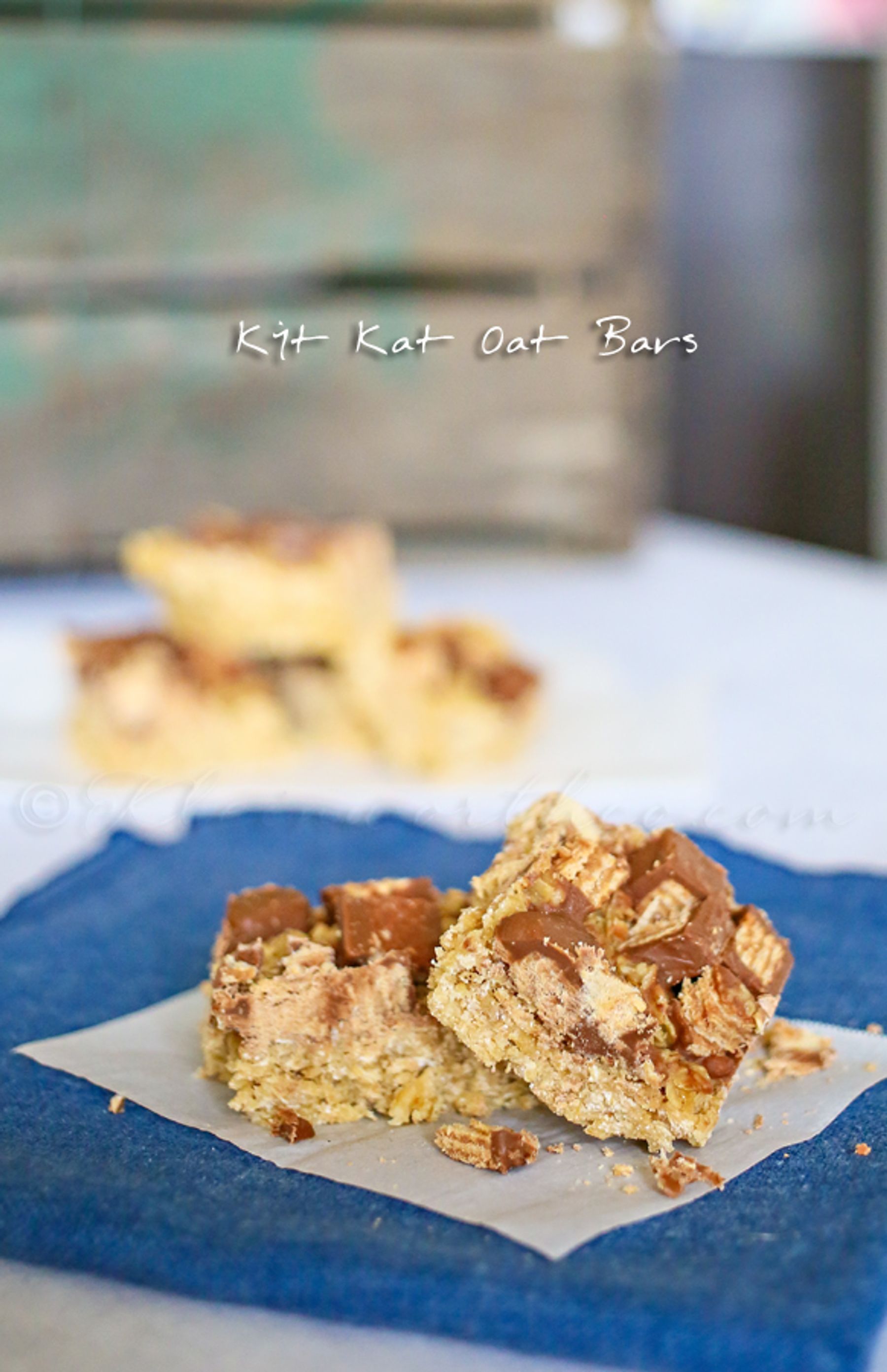 Simple no bake buttery oat bars topped with melted Kit Kat Bars.