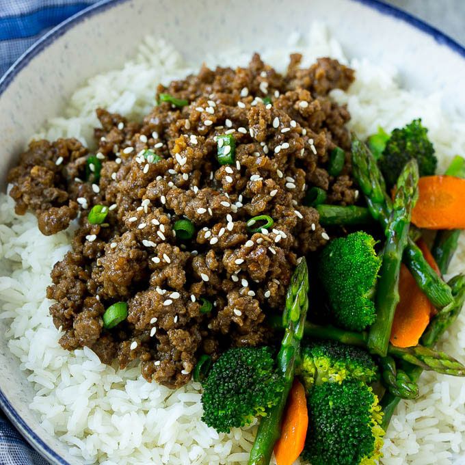 These Korean beef bowls are made with ground beef cooked in a sweet and savory sauce, steamed rice and a colorful assortment of vegetables. An easy dinner option that's ready in less than 30 minutes!