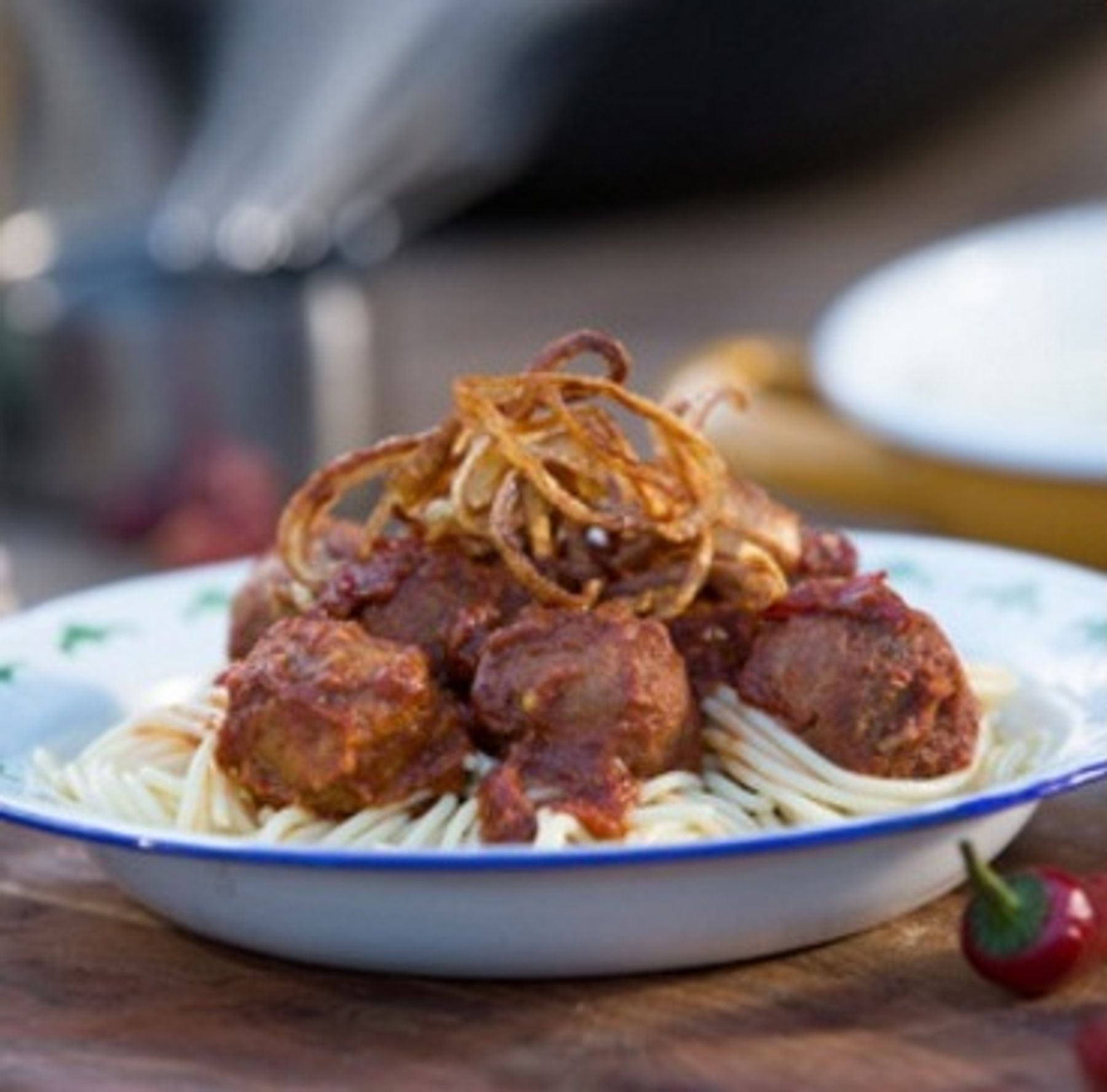Koshari is an vegan dish which is originated from Egypt and made of rice, macaroni, chickpeas and lentils, topped with spicy tomato soup and fried onions.