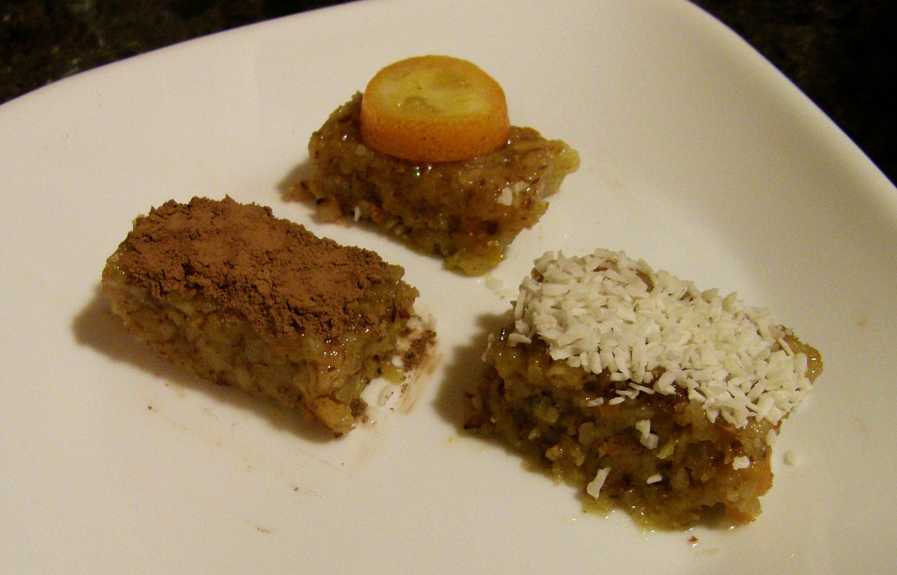 You can decorate the squares with shredded coconut, cacao powder, or kumquat slices.