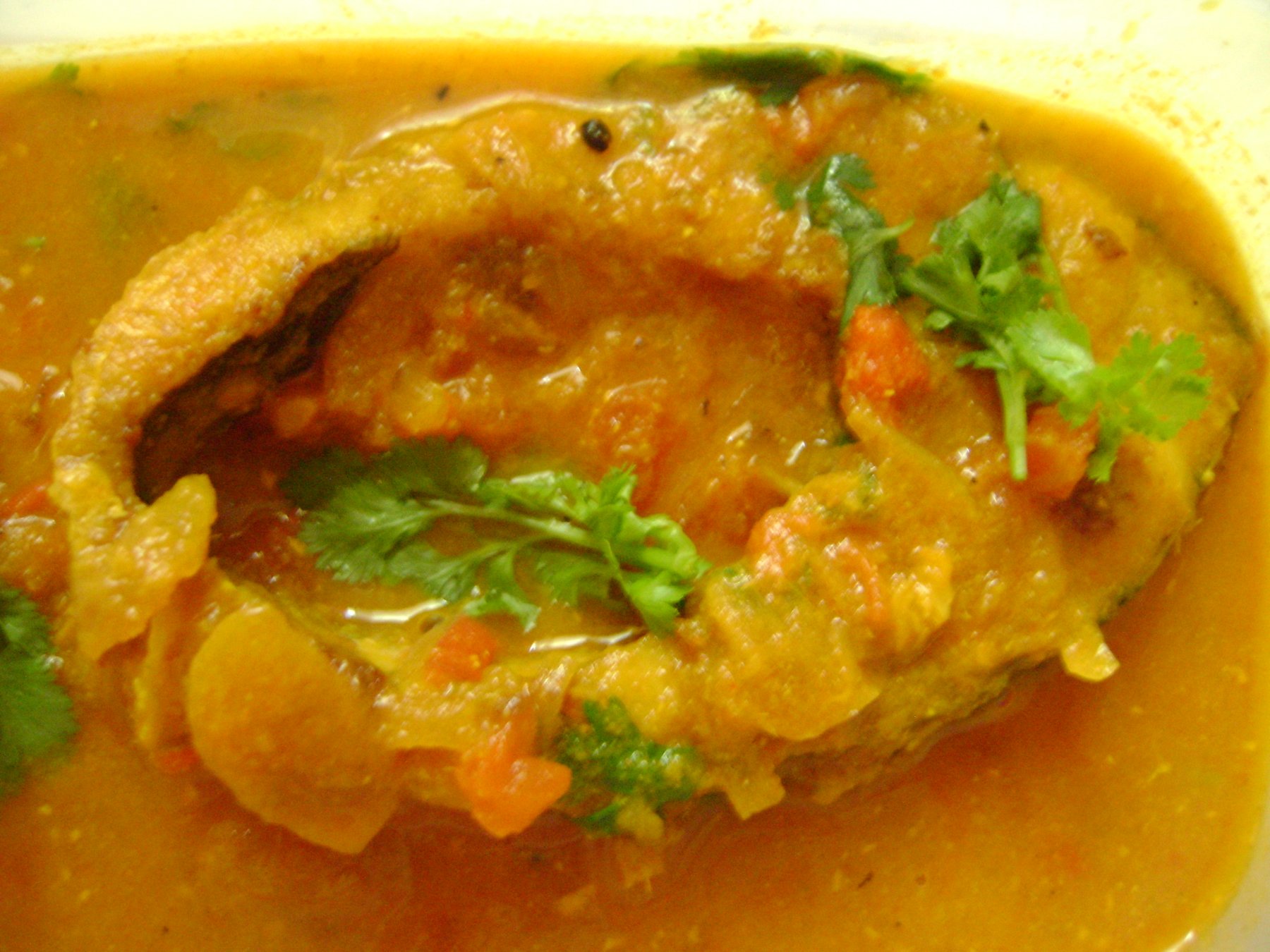 Method:- marinate the fish with a pinch of salt and turmeric powder. Keep aside for 5 minutes. Take a non stick pan, put some mustard oil and fry the fish for some time both the sides. Keep aside. In another nonstick pan again put some mustard oil, add chopped green chilly and onion, saute for 2 to 3 minutes, add ginger garlic paste, fry till it leaves the oil, add tomato and add a little sugar to sweat the tomato, add cumin powder,coriander powder, turmeric powder, and fry for 2 minutes, add the curd mix it well, add 1 cup of water, add salt to taste let it boil and add the fish simmer for sometime in a very low flame, garnish it with fresh coriander, serve hot with steamed rice.
