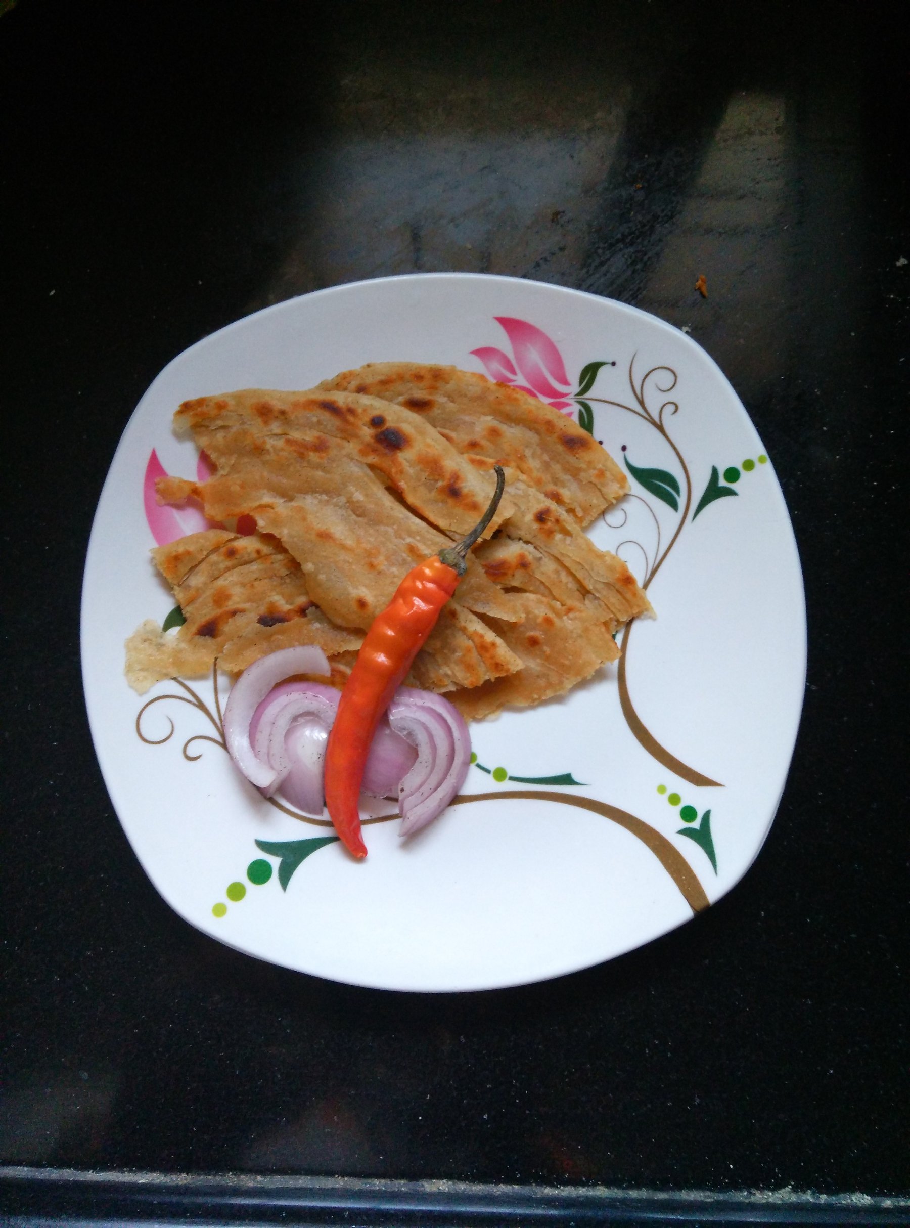 A layered wheat flat bread that tastes good with almost every gravy curry.