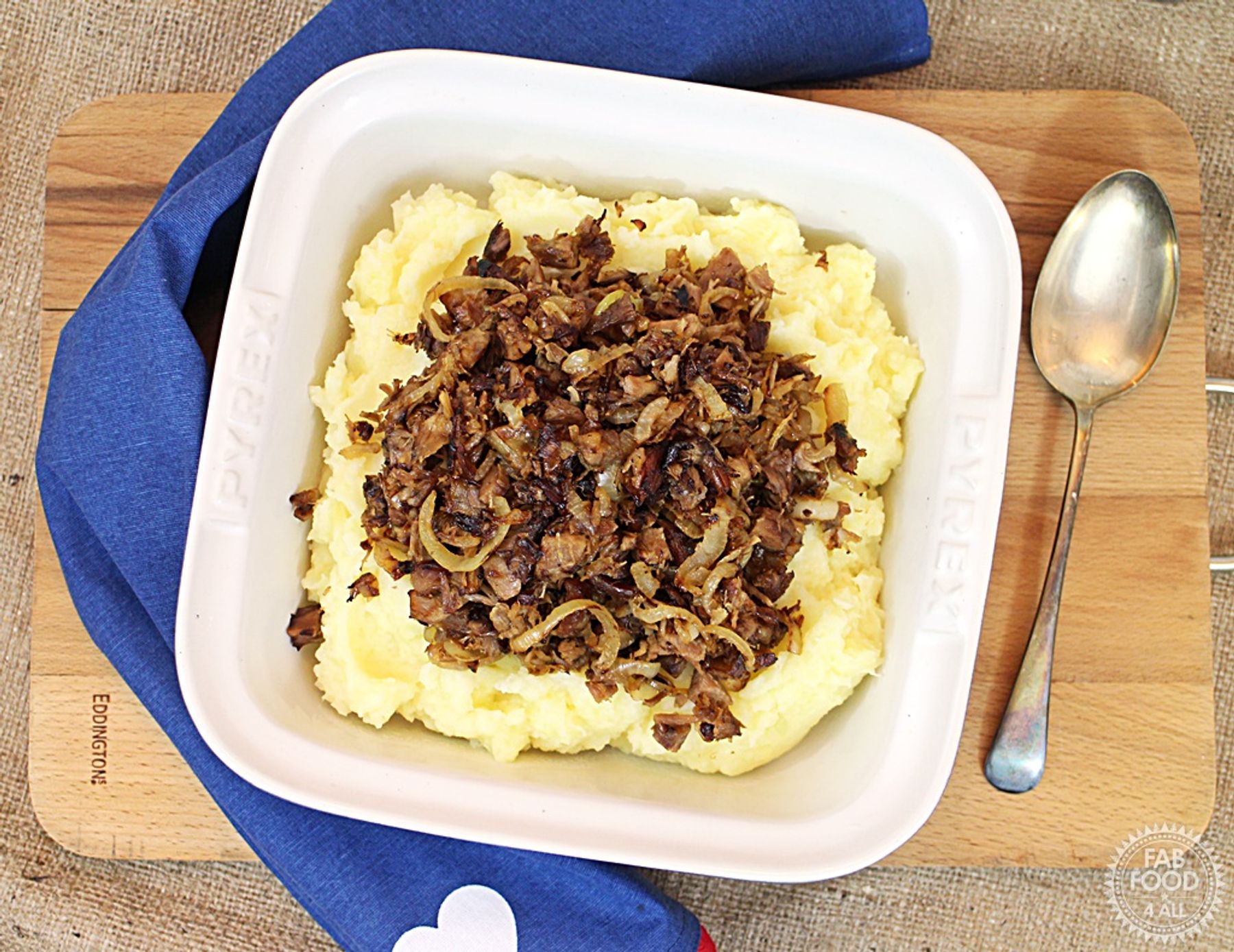 My mums Anglo Danish fusion of a traditional Danish dish called Burning Love which was traditionally made with bacon but this uses leftover roast lamb, fried up with onions and served on a bed of mashed potatoes!
