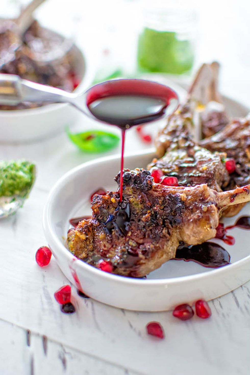Just a few simple ingredients make this delicious lamb chops! All you need is some pesto, pomegranate, and balsamic vinegar. Yummy!