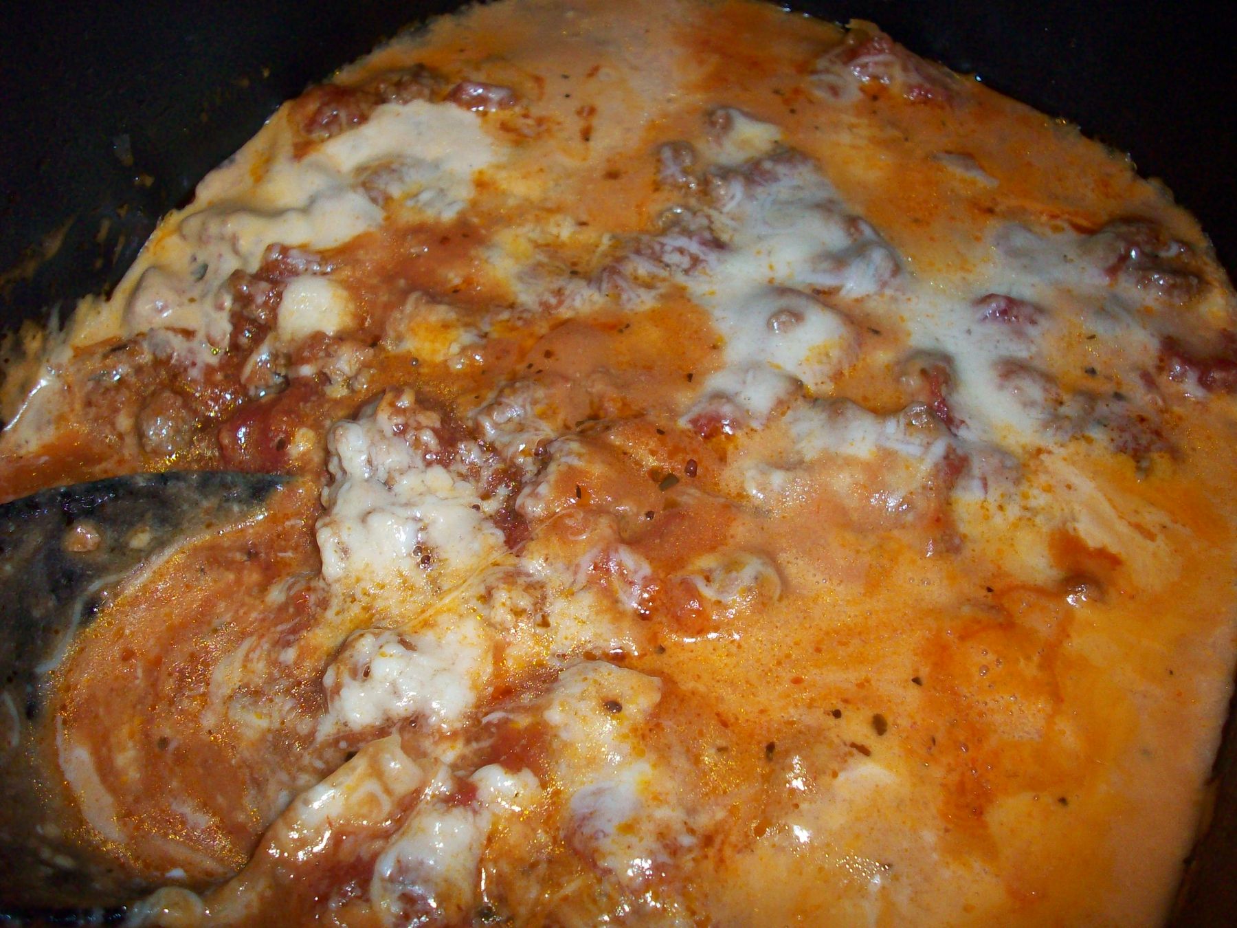 3. Layer 3 lasagna noodles (broken up into small pieces) over the sauce in the Ninja. Top with 1/3 of the Alfredo sauce, spreading evenly. Sprinkle with 1 cup of the mozzarella cheese. Top with the 1/3 of the ground beef mixture, spreading evenly.