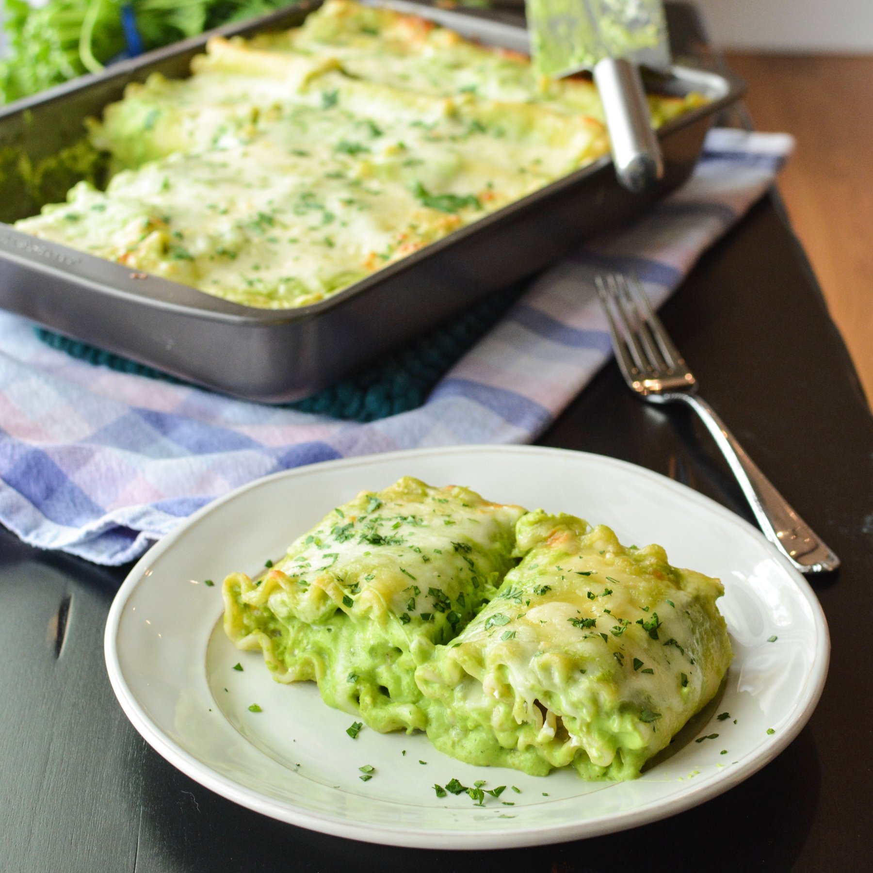 Lasagna Roll Ups with Herbed Sweet Pea Sauce