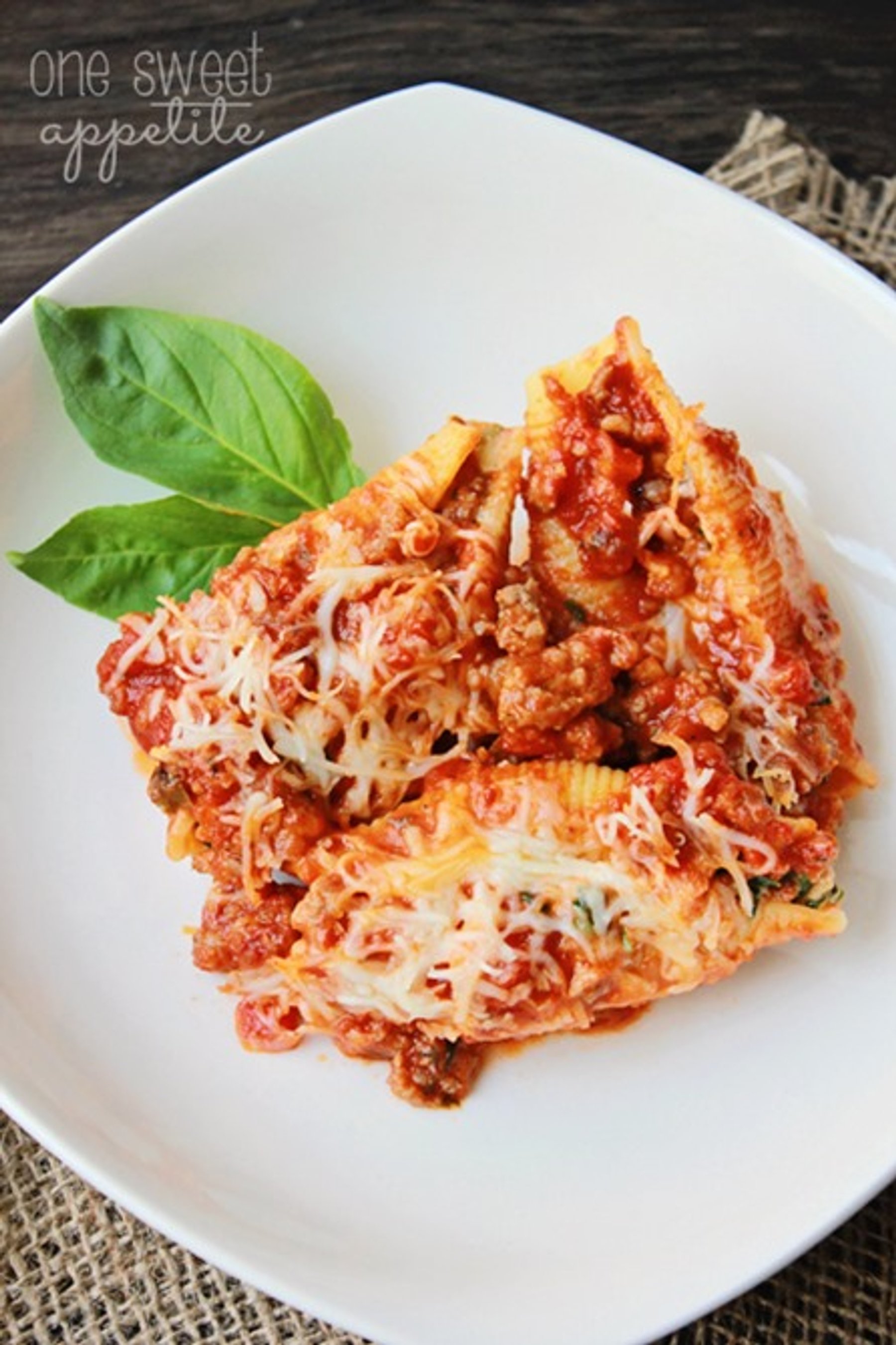 The classic lasagna filling is placed inside a large pasta shell and smothered in sauce and cheese.