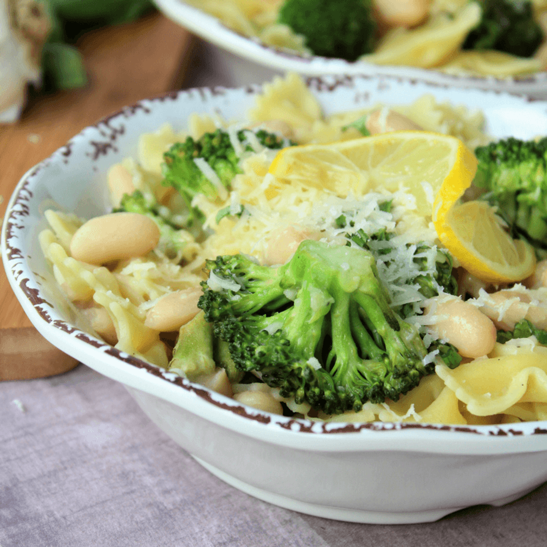 Last Minute Pasta Dinner with bow tie pasta, freshly squeezed lemon juice, garlic, basil, parmesan cheese, olive oil, and beans. Let’s face it. We all need a few great recipes that take under 20 minutes to prepare for busy weeknights
