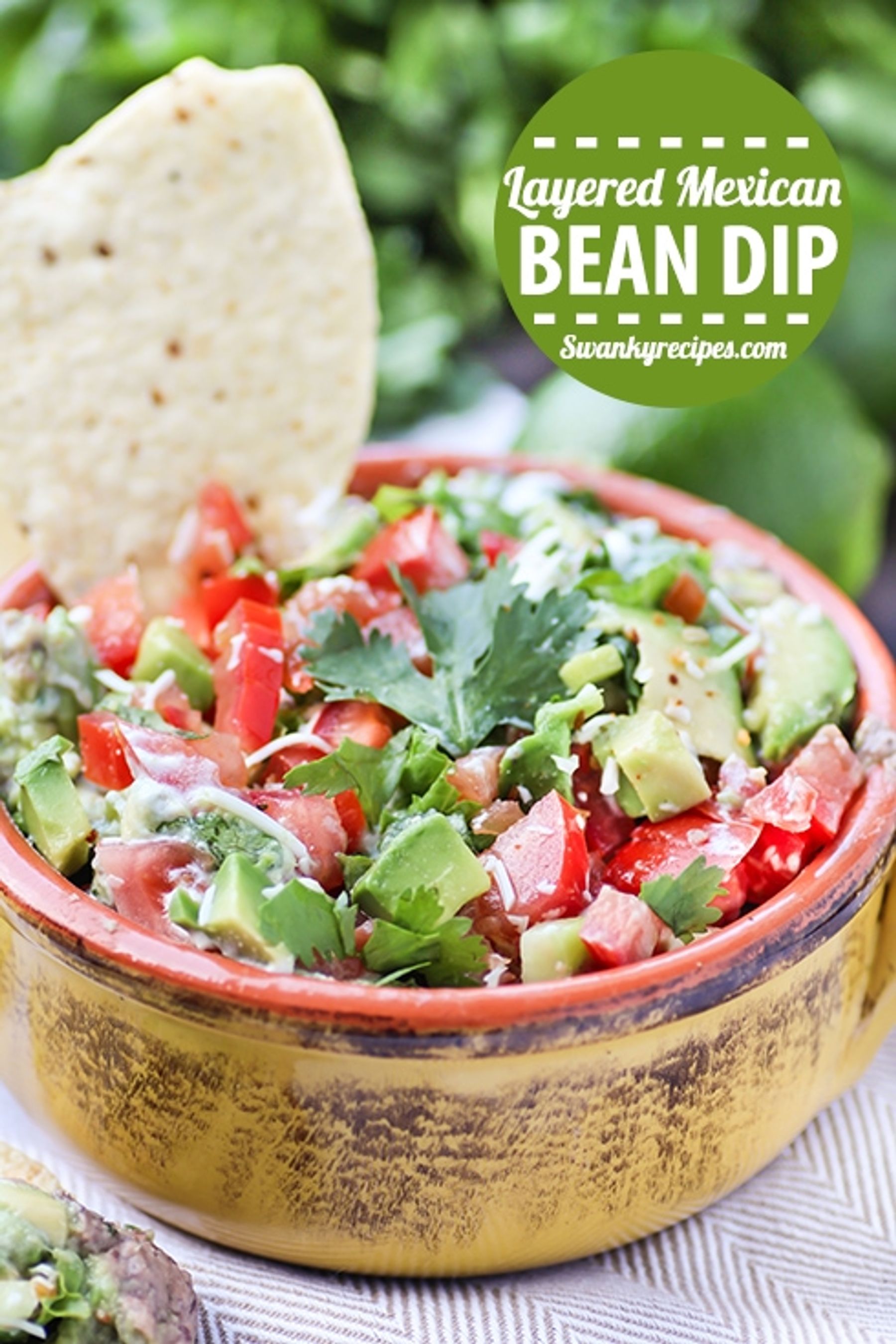 7 Layer Mexican Dip served with corn tortillas that is perfect for game day, parties or as a snack. This dip starts with spiced beans, fresh guacamole and sour cream and is topped with fresh vegetables.