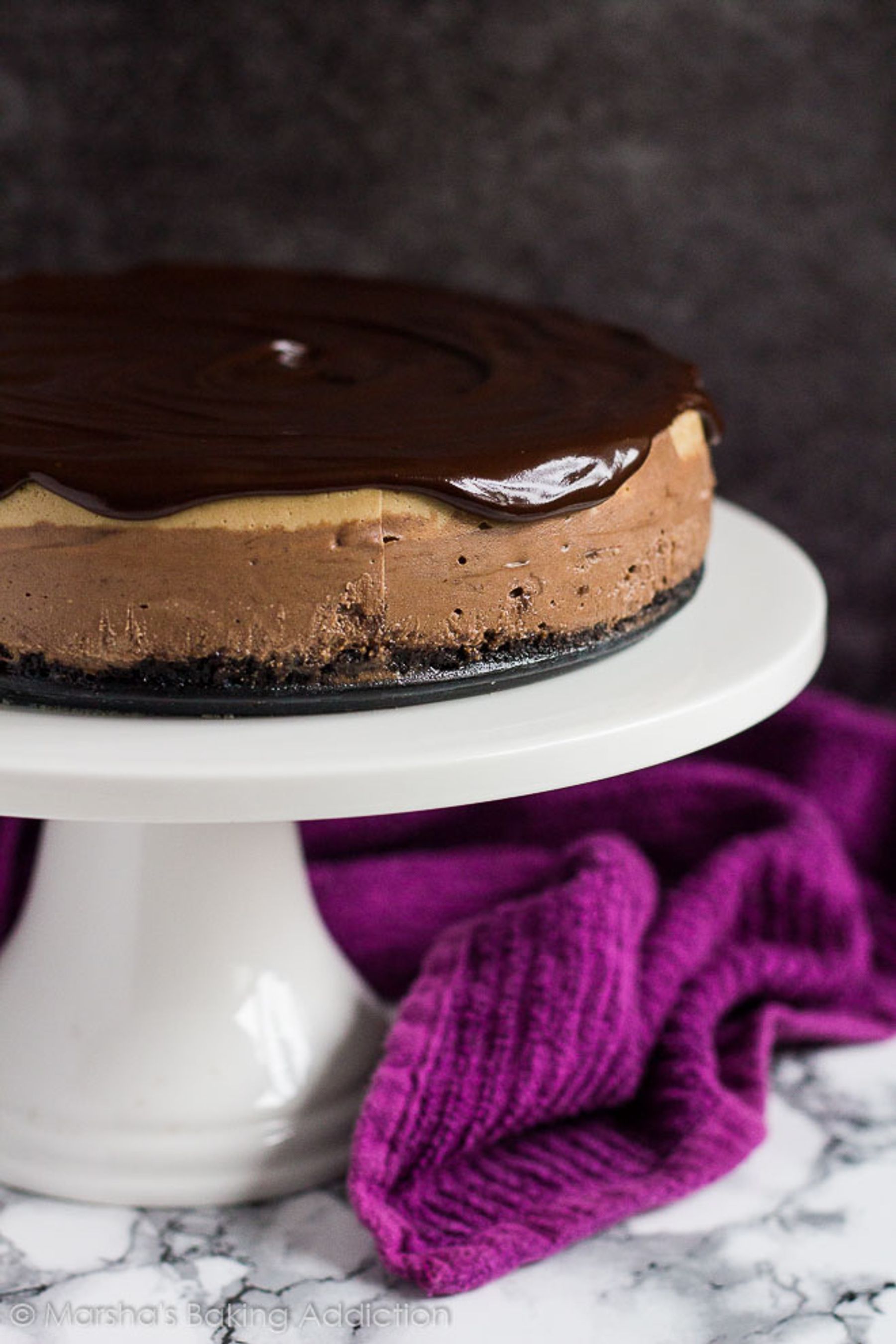 An Oreo crust topped with a deliciously creamy chocolate cheesecake layer, a coffee cheesecake layer, and dark chocolate ganache!