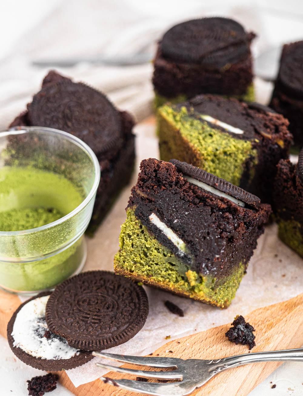 Oreos sandwiched between layers of fudgy matcha and decadent chocolate brownie. A take on the 'slutty' brownie, these layered matcha oreo brownies are the sweet treat you've been looking for.
