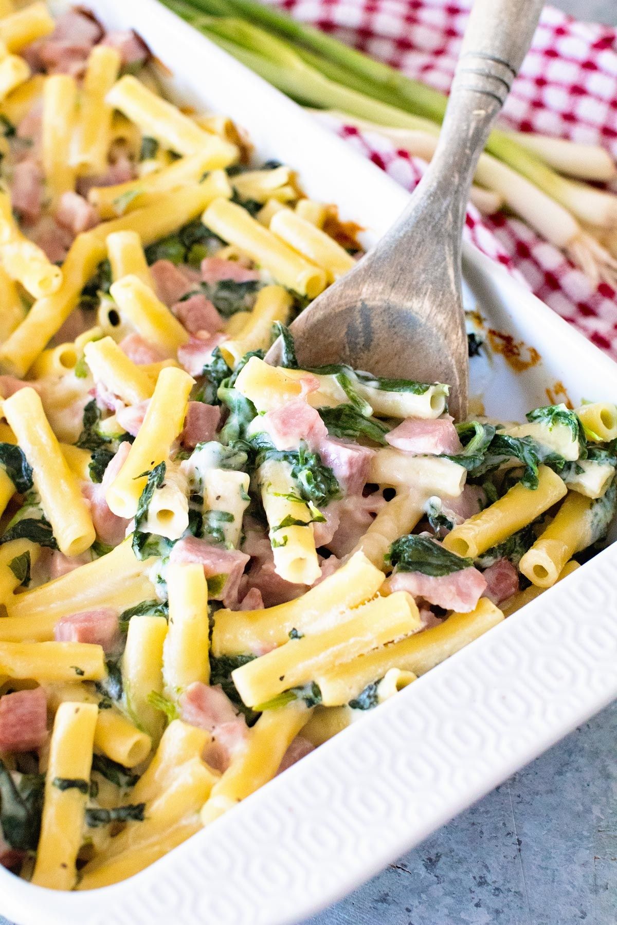 Leftover Ham and Spinach Casserole ~ Delicious way to use your leftover ham up! This casserole is stuffed with spinach, ham, cheese and ziti noodles for a delicious dinner recipe! Perfect recipe to use leftover ham up!