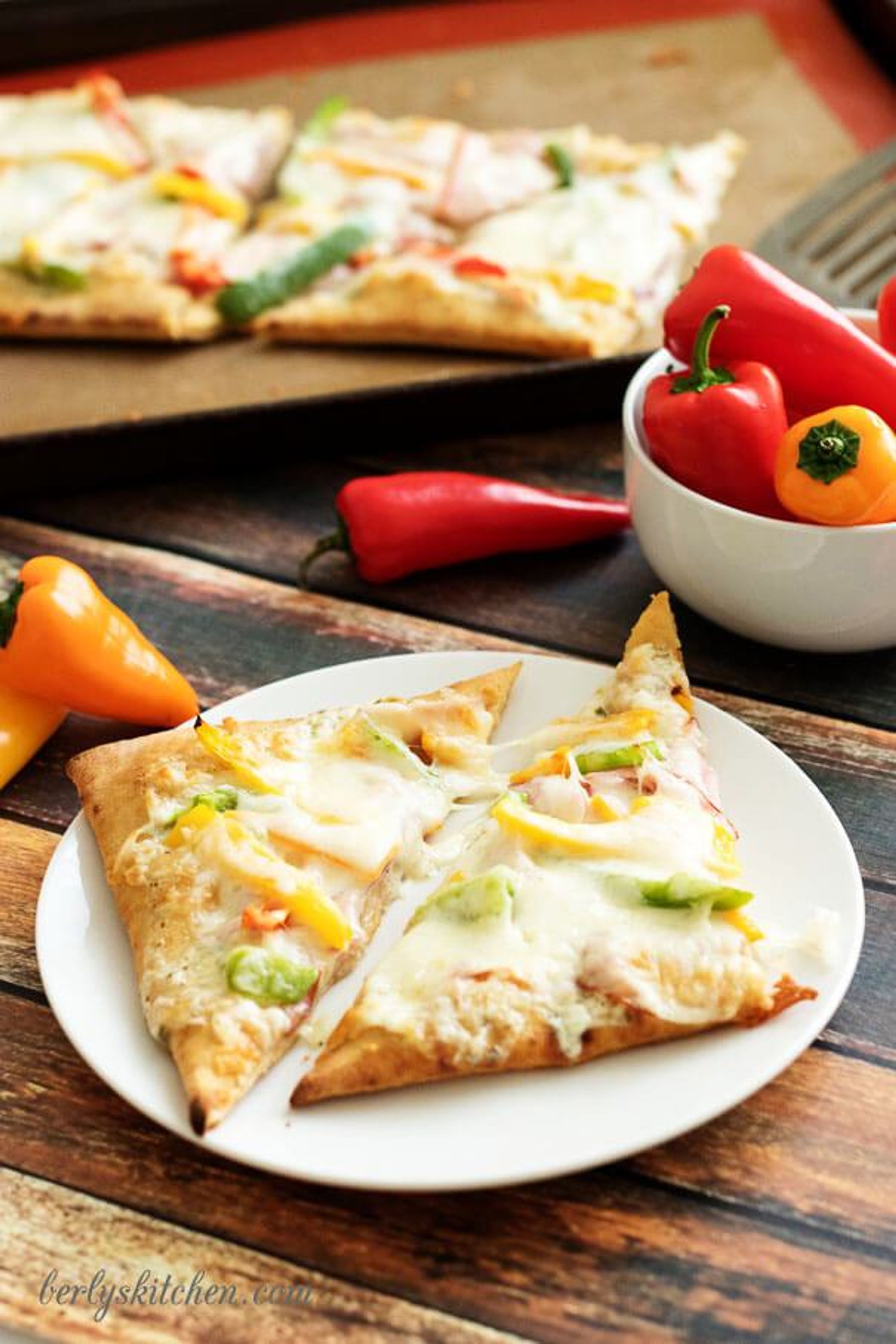 Our leftover ham, pepper, and ranch flatbread combines the flavors of cured ham, sweet colorful peppers, creamy ranch dressing and rich mozzarella cheese.