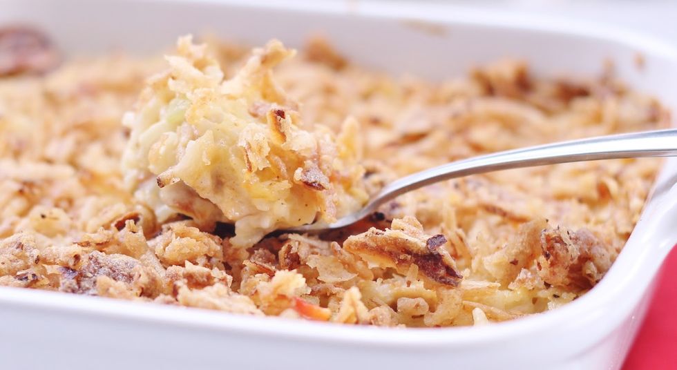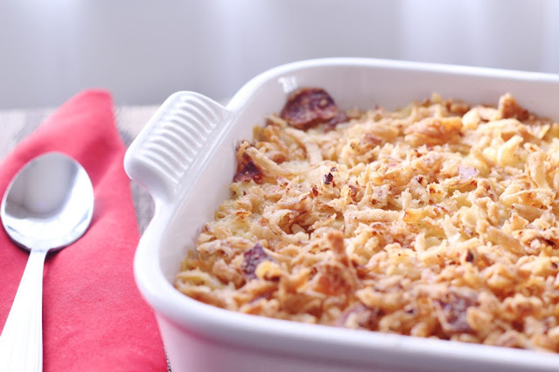 This is a wonderful, flavorful way to use your leftover turkey after a holiday dinner. Mixed with cooked rice, peas and corn all wrapped in a creamy sauce and topped with crunchy French fried onions. The perfect comfort food for a wintry night.