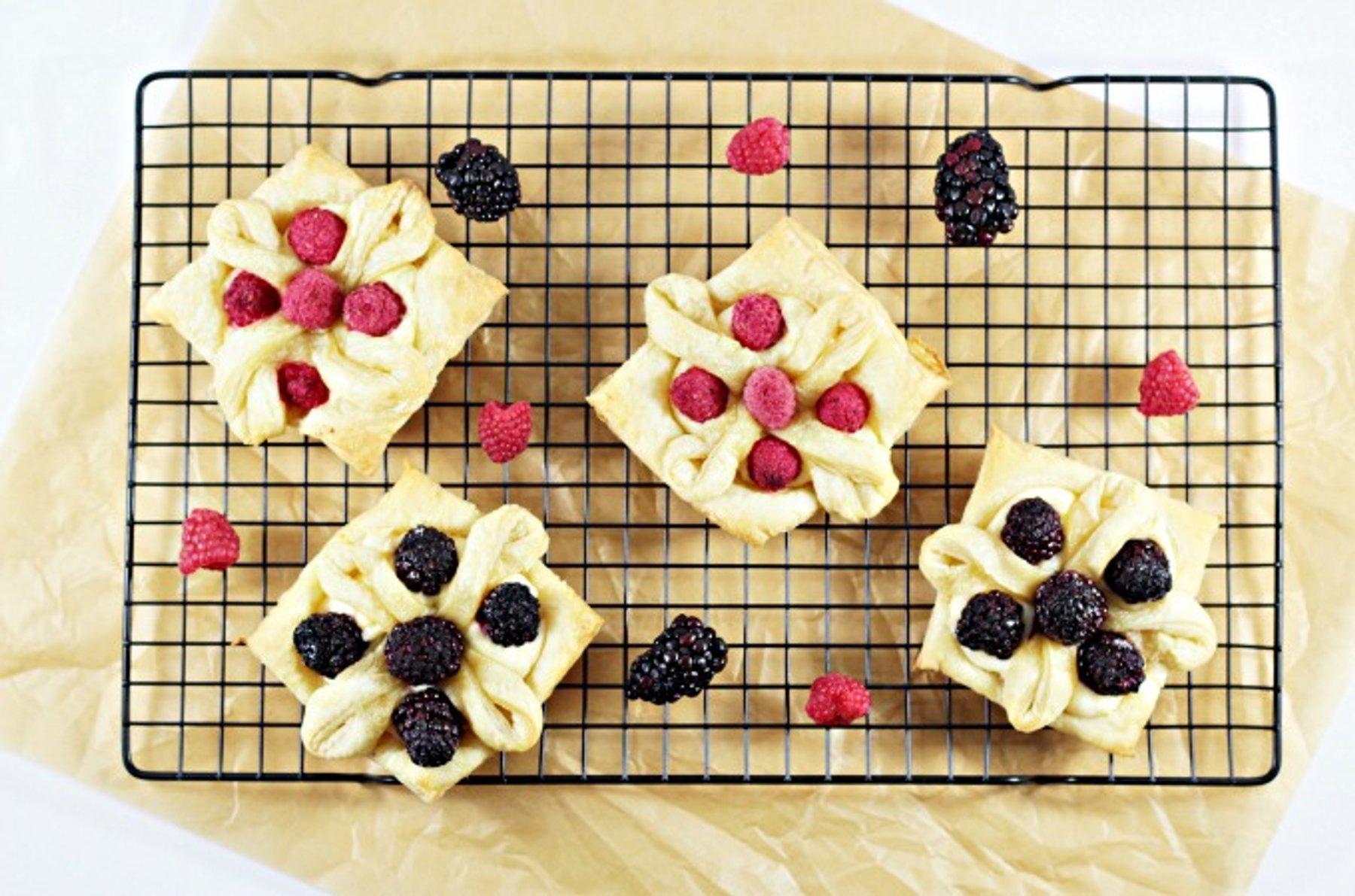 These pastries use store bought puff pastry, cream cheese, sugar, lemon, vanilla, and fresh berries. So impressive, yet so easy!