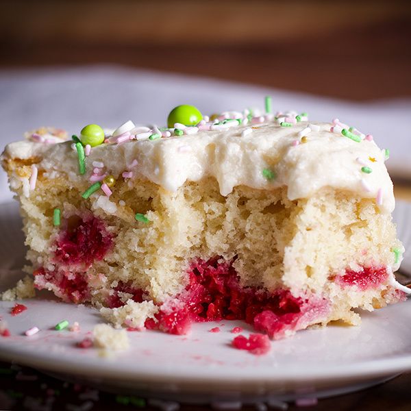 Soft, fluffy squares of vanilla butter cake, flavored with lemon and berries and slathered with sweet-tart lemon icing. Sprinkles recommended. Plate and fork not required. Get the recipe: https://ofbatteranddough.com/berry-lemon-snack-cake/