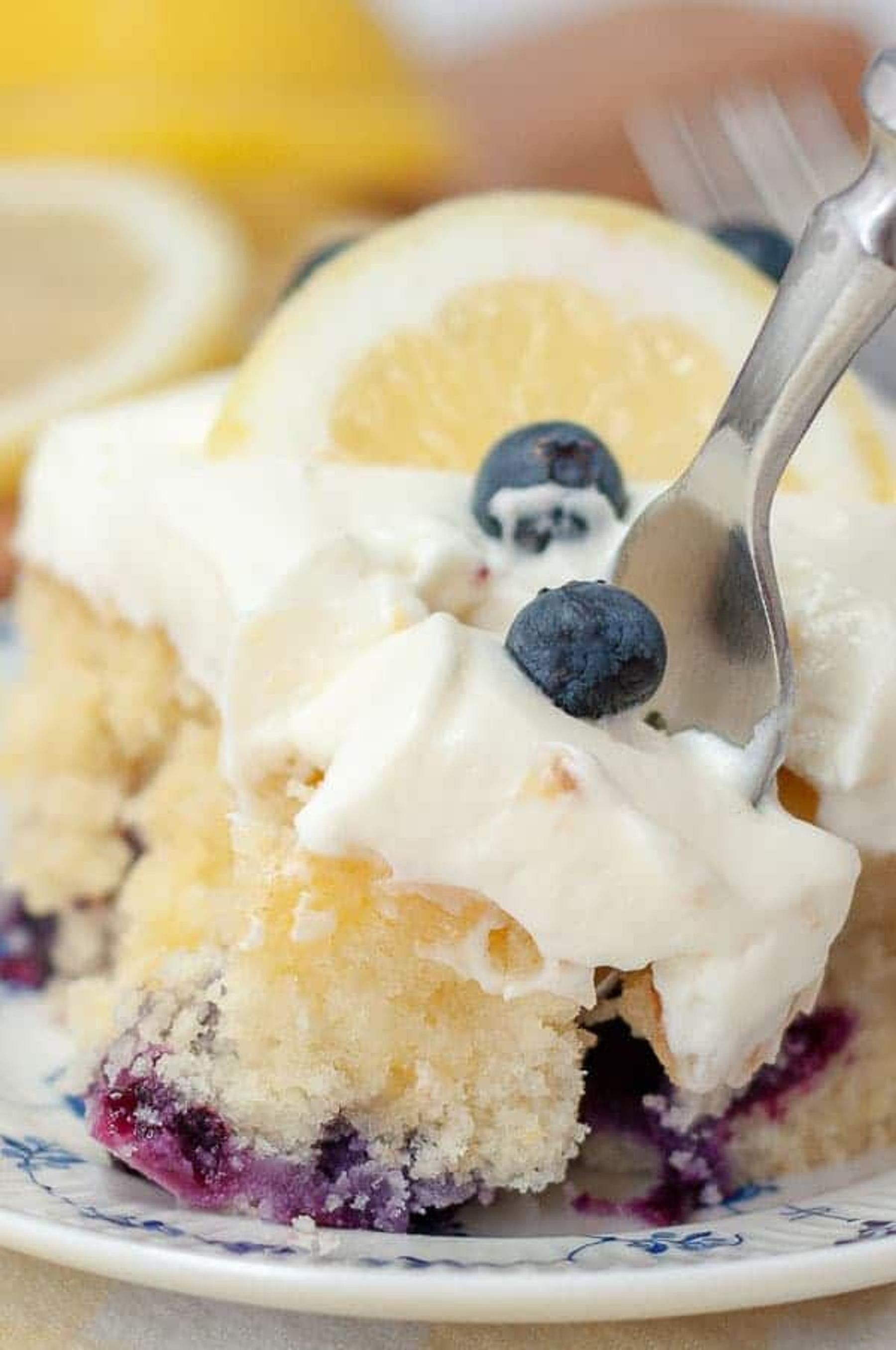 The BESTÂ Lemon Blueberry Cake recipe out there! A lemon glaze drizzle is soaked into a fluffy lemon blueberry cake with whipped cream cheese frosting on top.